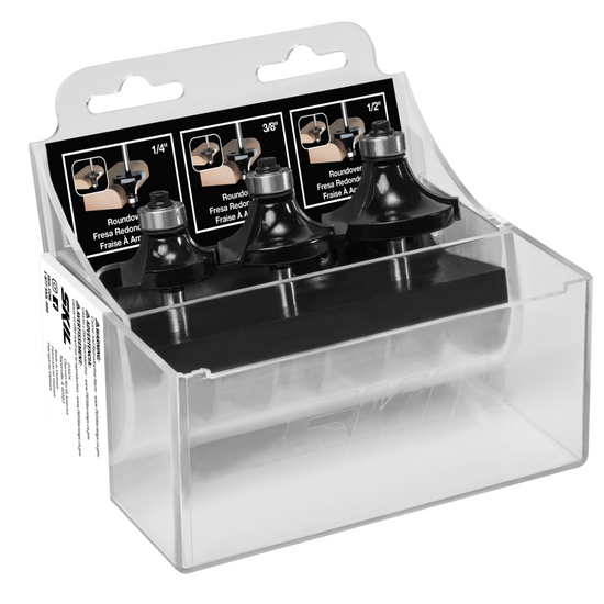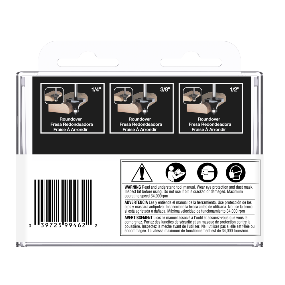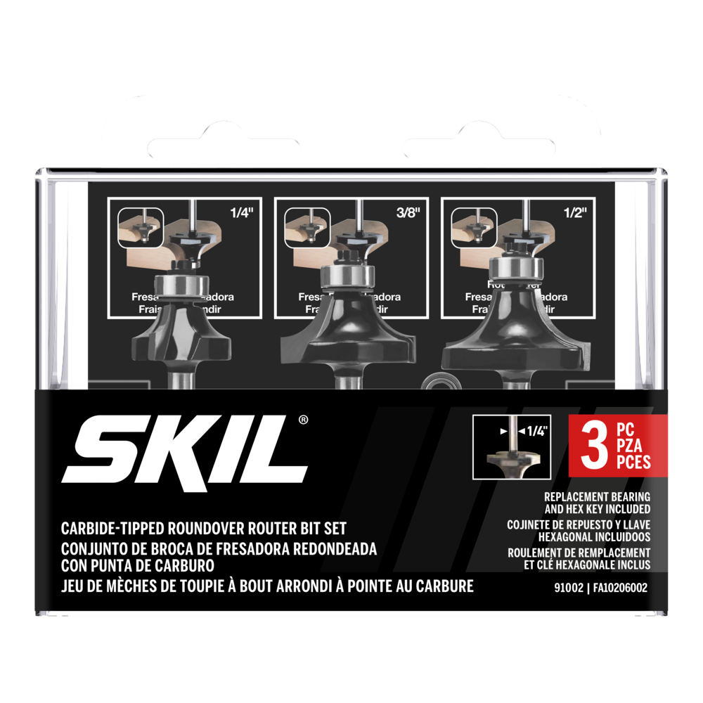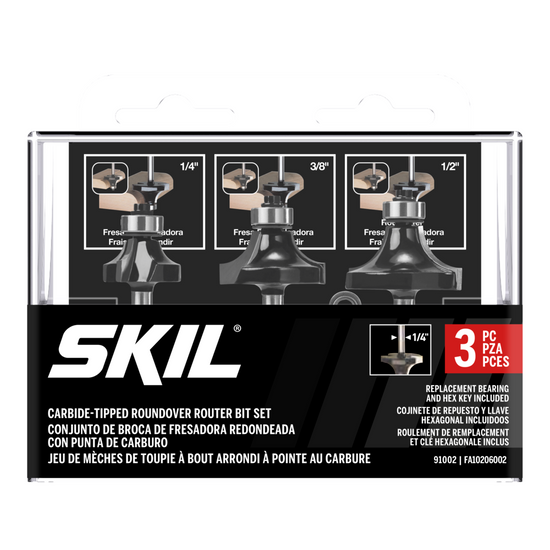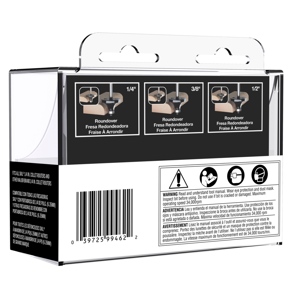 - Includes: (1) 1/4-inch, (1) 3/8-inch and (1) 1/2-inch roundover bits