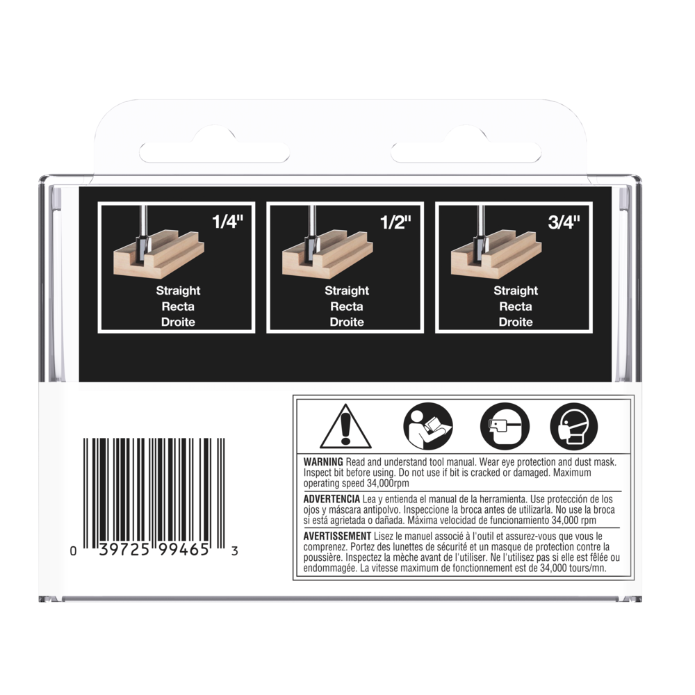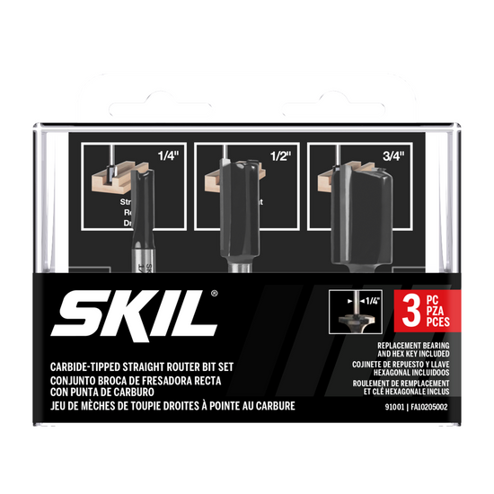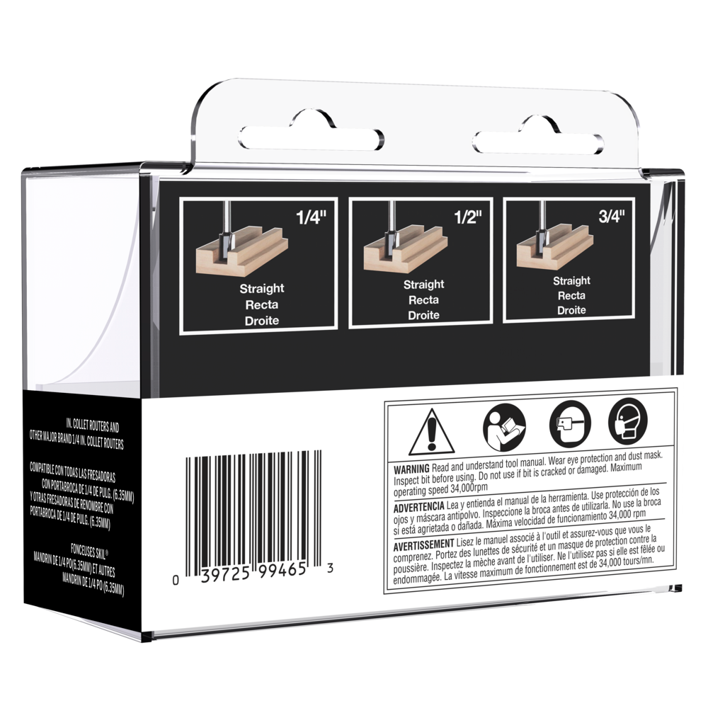 - Includes: (1) 1/4-inch, (1) 1/2-inch, and (1) 3/4-inch straight bits