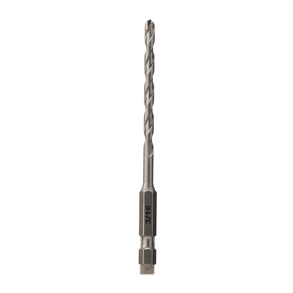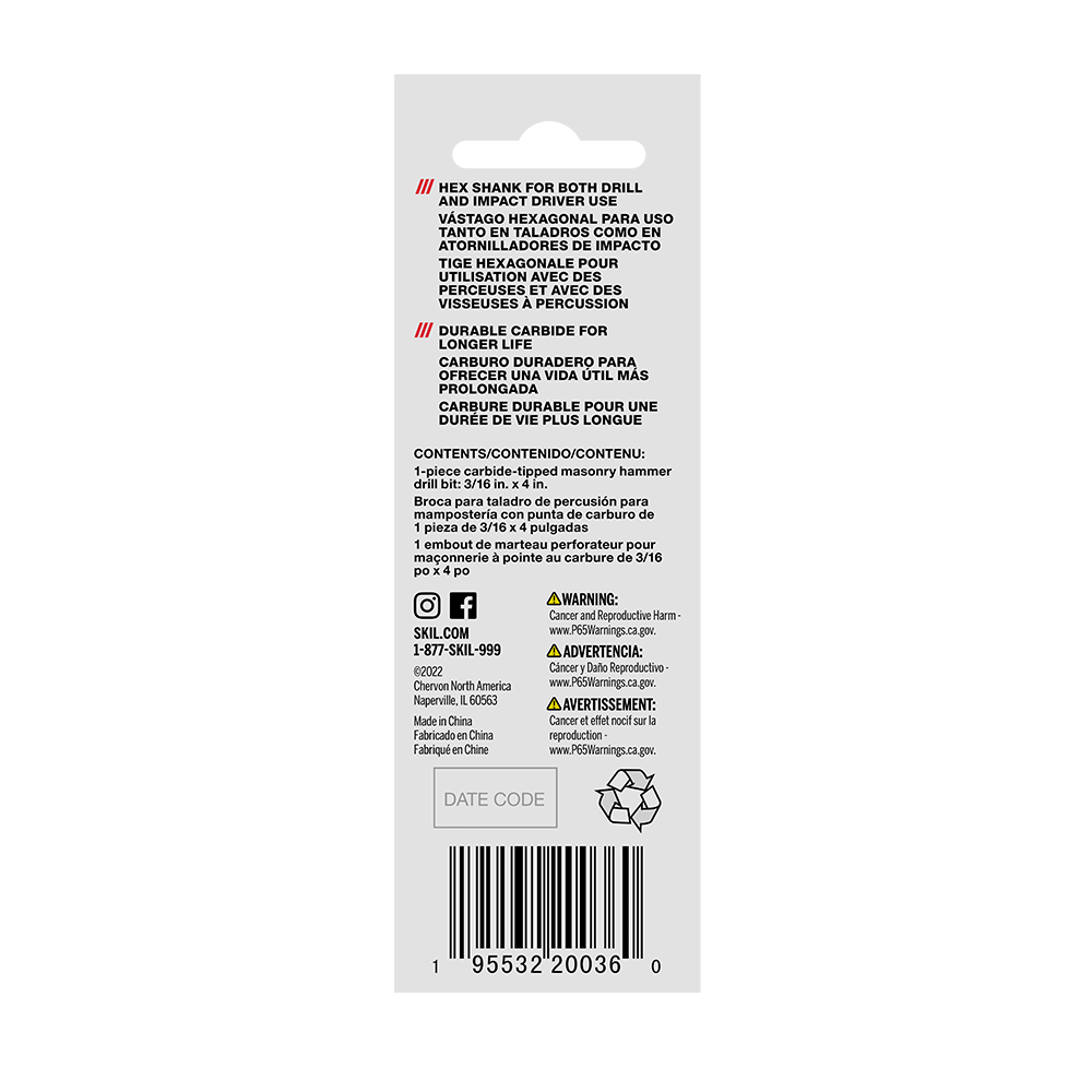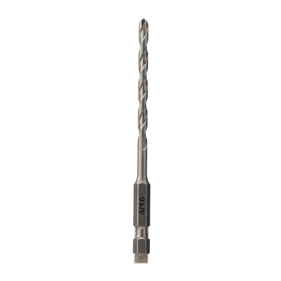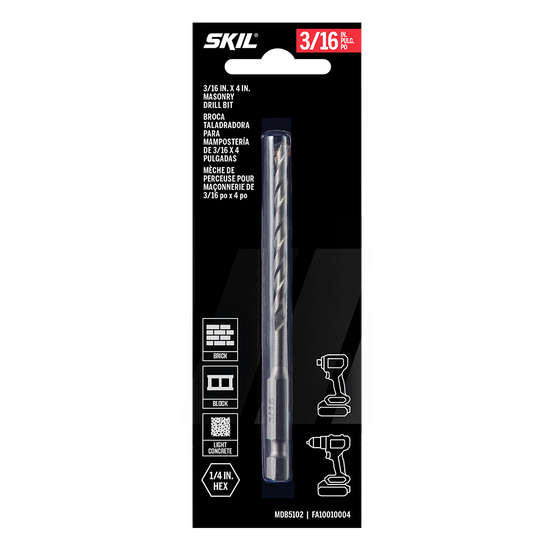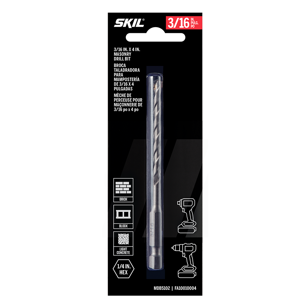Set anchors, drill pilot holes, and power through brick, cinder block, concrete, and other masonry with the SKIL 3/16 In. Carbide Tipped Masonry Drill Bit. This 3/16-inch masonry drill bit features a dual-cutting carbide tip that optimizes drilling speed while retaining its edge. The bit features a split point tip optimized for speed and precision while dual flutes allow for fast debris removal without slowing or bogging down when cutting through brick and concrete. The masonry bit can be used in both hammer and rotary modes. Its ¼-inch hex shank provides superior grip with a three-jaw chuck or typical hammer drill while allowing compatibility with impact drivers. Heat-treated for extra strength, the shank and body allow the bit to withstand the abuse of drilling through masonry like block, concrete, and more when used in hammer mode. The bit is clearly labeled with bold print so it can be easily identified—no straining to read a tiny hairline imprint. Power through your next masonry project confidently with the SKIL 3/16 In. Carbide Tipped Masonry Drill Bit.