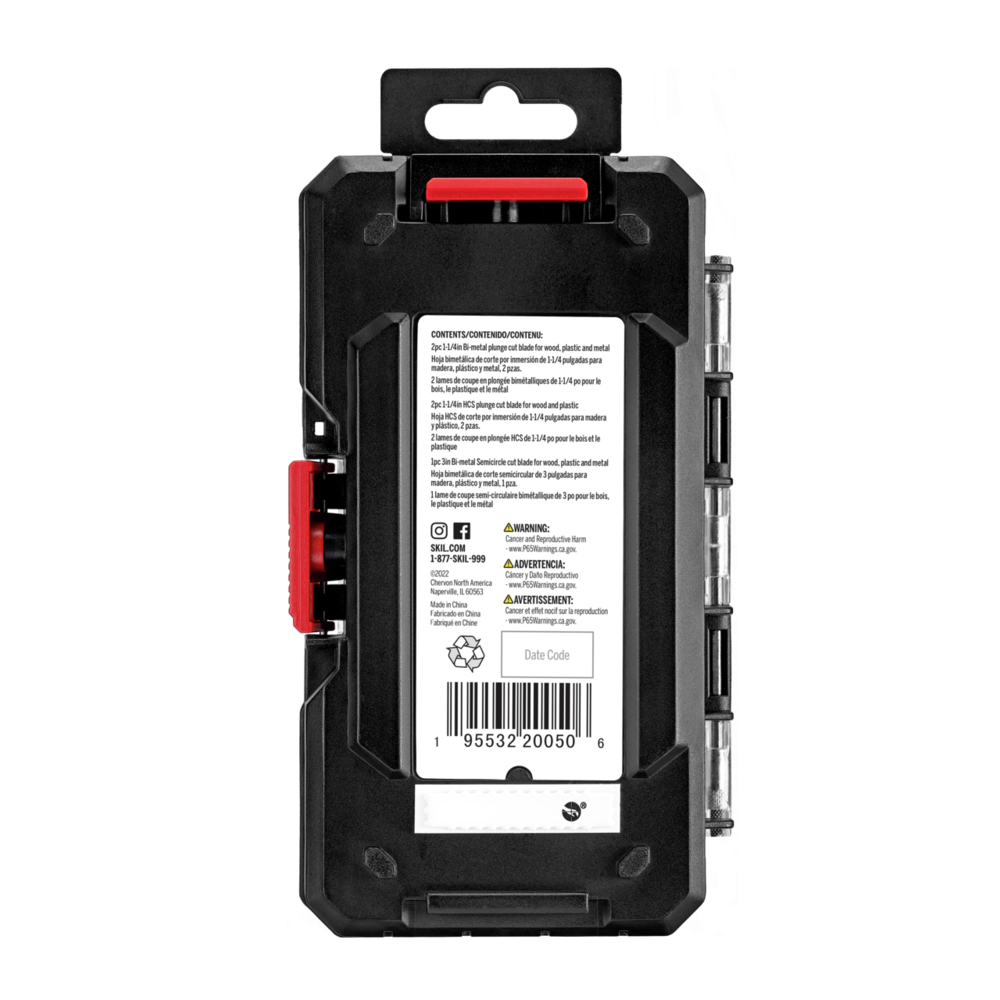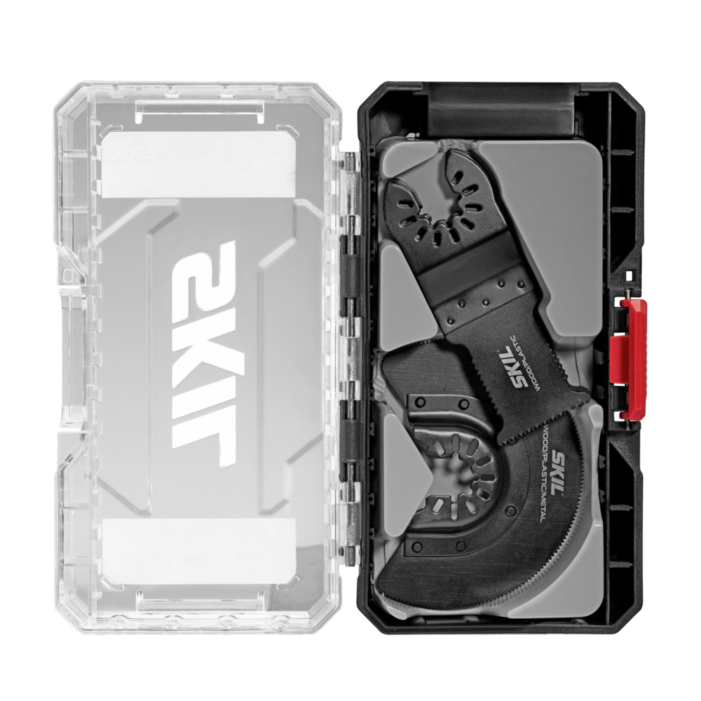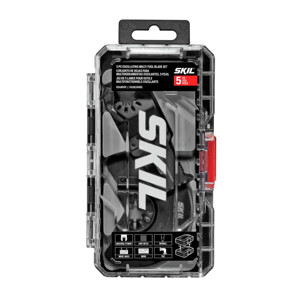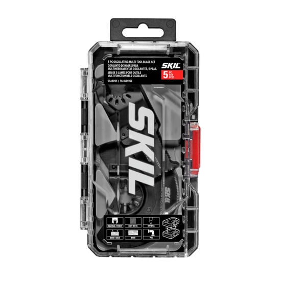 The SKIL 5 Pc. Oscillating Multi-Tool Blade set features five oscillating blades for a variety of applications and materials including wood, plastic, and metal. The blade set features two 1 ¼-inch bi-metal plunge cut blades for plunge cutting into harder materials like hardwoods, plastic, and metal. Two included 1 ¼-inch high-carbon steel blades are optimized for cutting softer materials like softwoods and softer plastics. A bi-metal semicircle blade is included for cutting wood, plastic, and metal. Every blade in this five-piece oscillating multi-tool set is compatible with all SKIL oscillating multi-tools as well as tools featuring the Universal Oscillating Interface System™. The blades come in an interlocking case with a clear lid for easy identification, quick bit removal, and interlocking compatibility with other SKIL accessory cases for custom configurations.