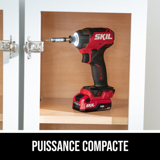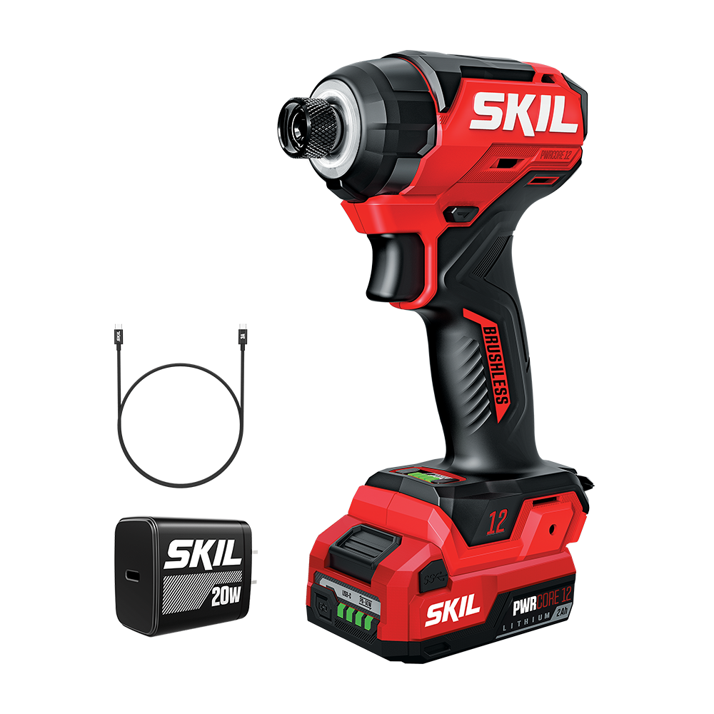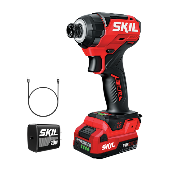 The SKIL PWRCORE 12™ Brushless 12V ¼-Inch Compact Impact Driver packs 1,500 inch-pounds of torque into a compact design that is 1 inch shorter than its previous generation, making it the ideal compact cordless impact driver for working overhead or in hard-to-reach spaces. Its digital brushless motor provides high-performance compact power and durability for extended tool life. Control mode helps eliminate screw cam-out and cross-threading while its three-speed selection allows for precise control at lower speeds to maximum power at higher speeds. Light up your workspace with 5X more light than common LEDs with the Halo Light™ and enjoy fast and secure one-handed bit insertion with the one-handed collet. Complete your projects with confidence with the power and precision of this cordless impact driver. The included 12V 2.0Ah USB-C battery features two-way rapid charging that allows you to charge the battery or portable devices with its 60W USB-C port. When it’s time to recharge the battery, the multifunctional charger ditches the traditional power tool charging dock for a compact, convenient format that can plug in anywhere. This cordless electric impact driver kit includes the 12V impact driver, 12V 2.0Ah USB-C battery, 20W USB-C charger, USB-C charging cable, belt clip, 2-inch PH2 bit, and battery jacket.