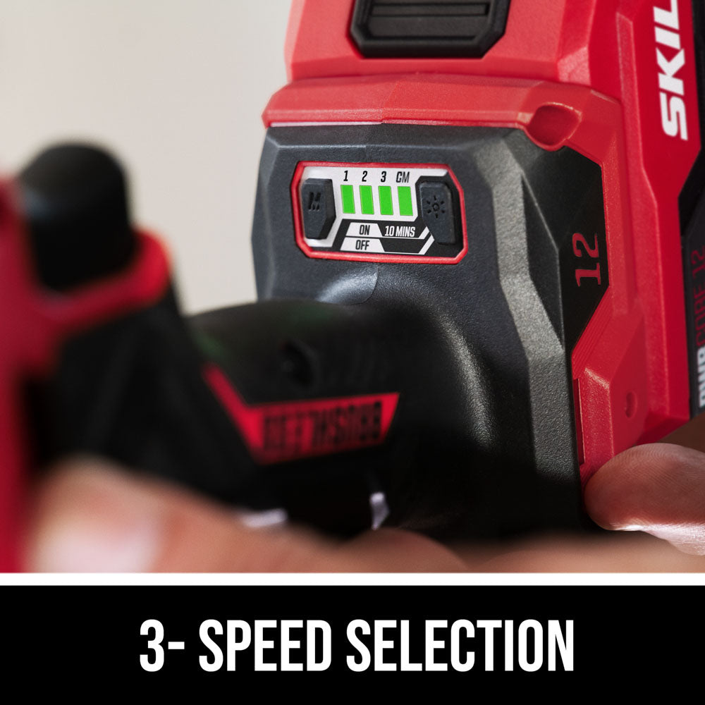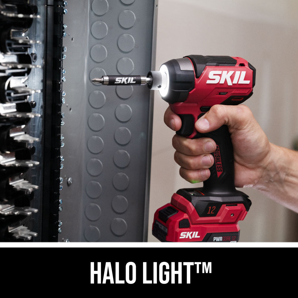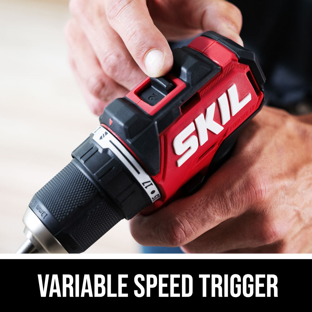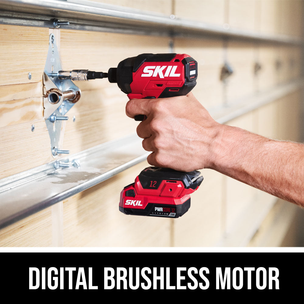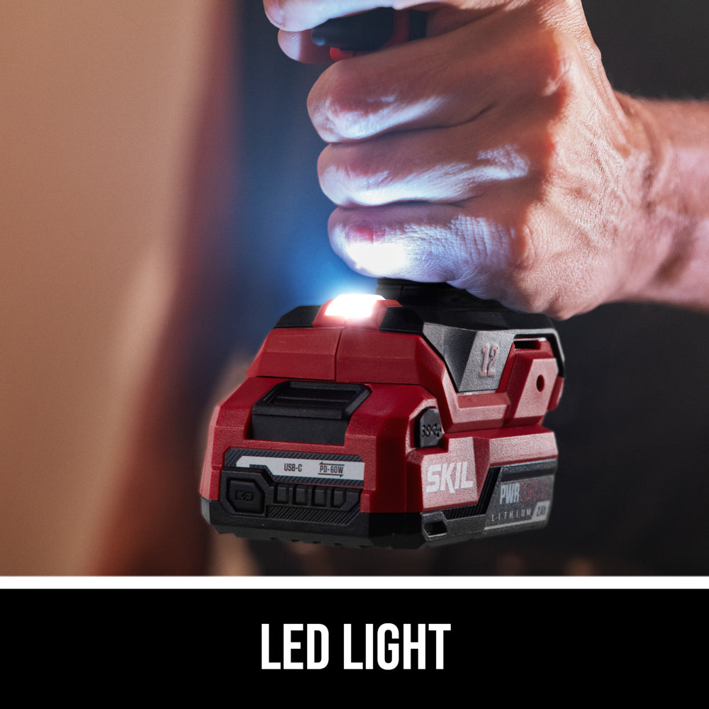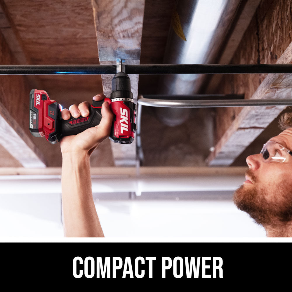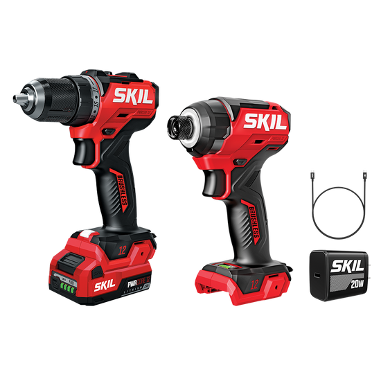 Tackle a variety of projects from light- to heavy-duty jobs with the compact cordless power in the SKIL Brushless 12V Drill Driver & Impact Driver Kit. Both the cordless impact driver and cordless drill driver pack big power into compact designs ideal for working overhead or in hard-to-reach areas. Loosen large bolts, drive screws through thick surfaces, and take on the toughest materials with the impact driver’s 1,500 inch-pounds of torque. Enjoy precise control with the drill driver’s variable speed trigger and change bits quickly and easily with its ½-inch single-sleeve keyless chuck. The included 12V 2.0Ah USB-C battery features two-way rapid charging that allows you to charge the battery or portable devices with its 60W USB-C port. When it’s time to recharge the battery, the multifunctional charger ditches the traditional power tool charging dock for a compact, convenient format that can plug in anywhere. This cordless electric power tool combo kit includes the cordless 12V drill driver, cordless 12V impact driver, 12V 2.0Ah USB-C battery, 20W USB-C charger, USB-C charging cable, PH2 bit, and belt clip.