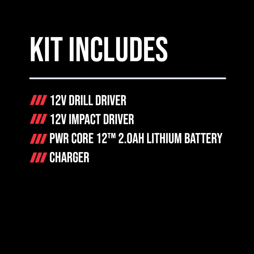 - 2-TOOL COMBO KIT—Set includes a Brushless 12V Drill Driver, Brushless 12V Impact Driver, 12V 2.0Ah USB-C battery, and 20W USB-C charger