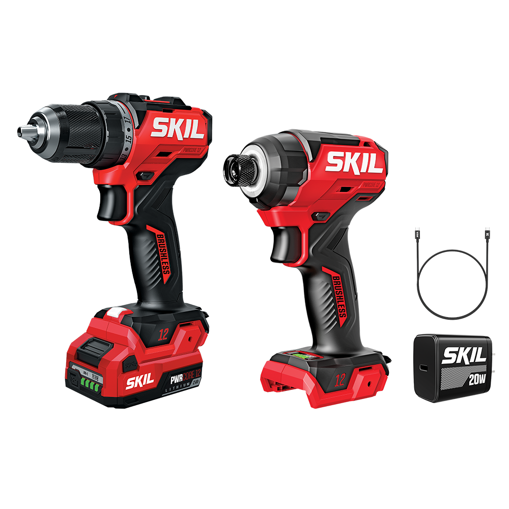 What's included: (1) SKIL PWRCORE 12™ Brushless 12V Impact Driver [ID6744A-00], (1) SKIL PWRCore 12™ Brushless 12V Drill Driver [DL6290A-00], (1) SKIL PWRCORE 12™ 12V 2.0Ah Lithium USB-C Battery [BY5020A-00], (1) SKIL 20W USB-C PD Charger [PD0020B-00], (1) 3A USB-C to USB-C Cable (PVC), (1) 2 in. Double End PH2 Bit, (1) 2 in. PH2 Bit, (1) Belt Clip