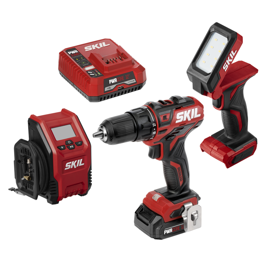 Get the everyday essentials you need to own your home or car, all in one convenient kit to cover your to-do list. This kit includes three SKIL PWRCORE 12™ products designed for compact power, efficiency and performance: Brushless 12V ½ IN. Cordless Drill Driver, 12V Area Light, and 12V Inflator. Drive through a variety of surfaces with confidence and precision with the PWRCORE 12™ Brushless 1/2 Inch Drill Driver. This electric drill’s brushless motor provides power in every drive, while the variable speed trigger switch provides maximum control for every project. The Inflator features a Digital Pressure Gauge up to 160 PSI. With a High Pressure Mode and Auto Shutoff for hands-free inflating, the compact and lightweight design makes it perfect for use in the car. The LED Area Light features 120-degree pivoting for around the room illumination or emergencies. PWRCORE 12™ Patented Battery Technology keeps the battery running cool and maximizes power for up to 25% longer run time and 2X the battery life. Whether it’s projects around the house, car, or garage, the SKIL 3-Tool combo kit will be your go-to for getting the job done.