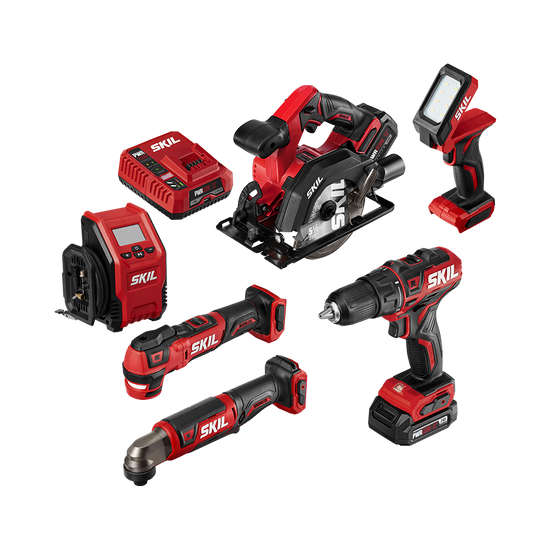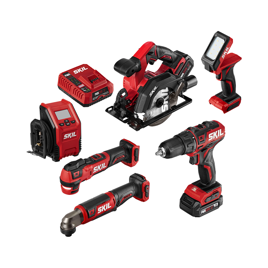 This tool combo kit includes the following PWRCORE 12™ tools: 1/2 Inch Drill Driver, 5-1/2 Inch Circular Saw, 1/4 Inch Hex Right Angle Impact Driver, Oscillating Multi-Tool, Compact Inflator, and Area Light. Includes the power and performance of the SKIL 4.0Ah PWRCORE 12™ Lithium Battery with PWRASSIST™ Mobile Charging, 2.0Ah PWRCORE 12™ Lithium Battery with PWRASSIST™ Mobile Charging, and PWRJUMP™ 5-minute Charger.
