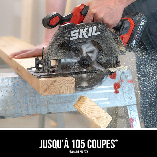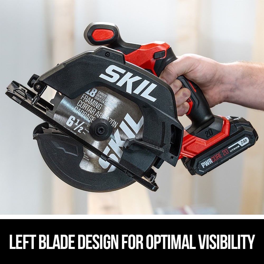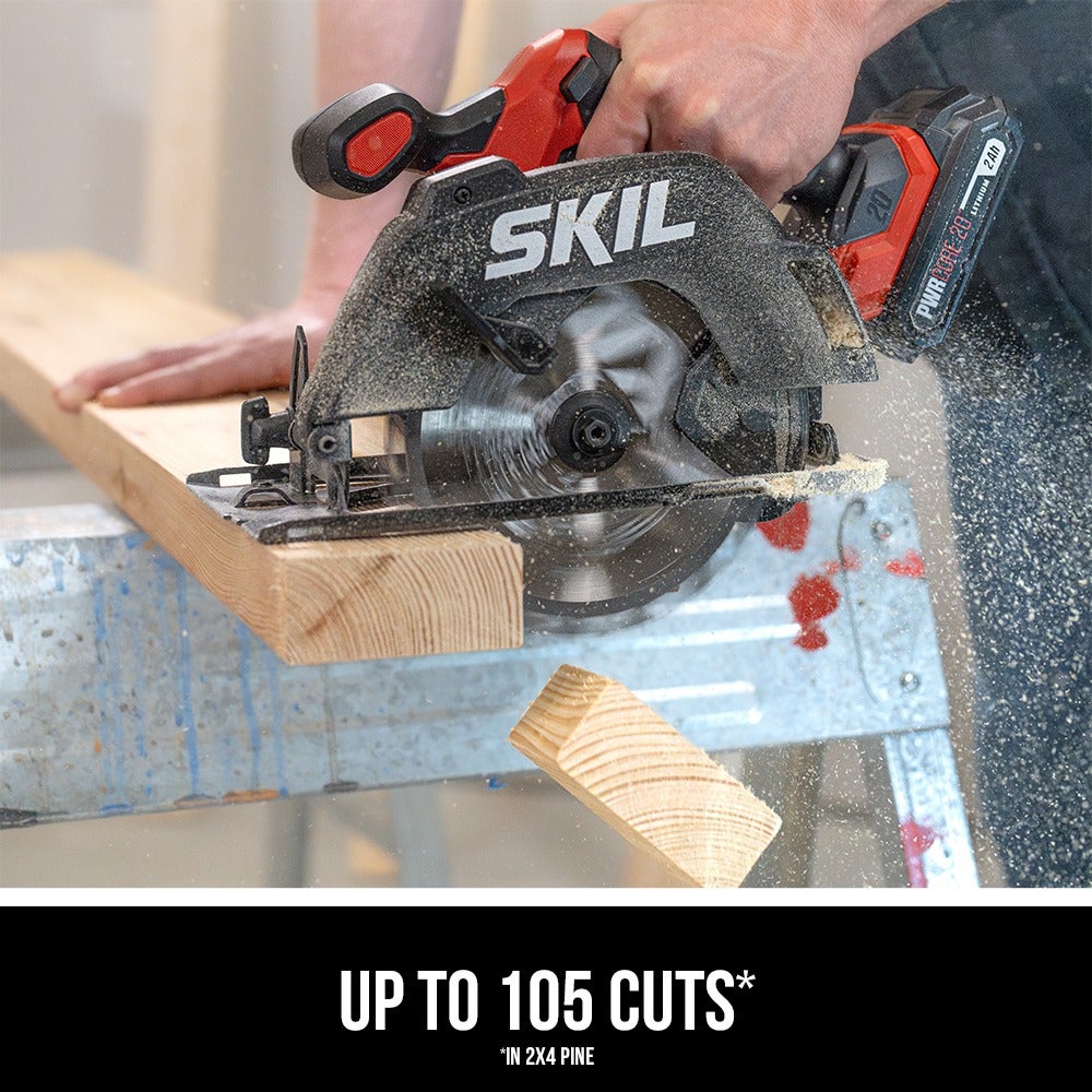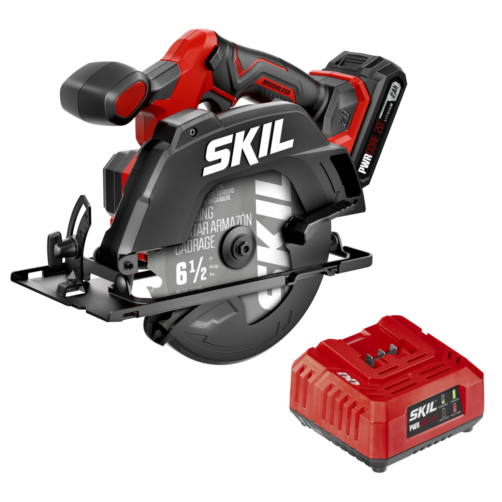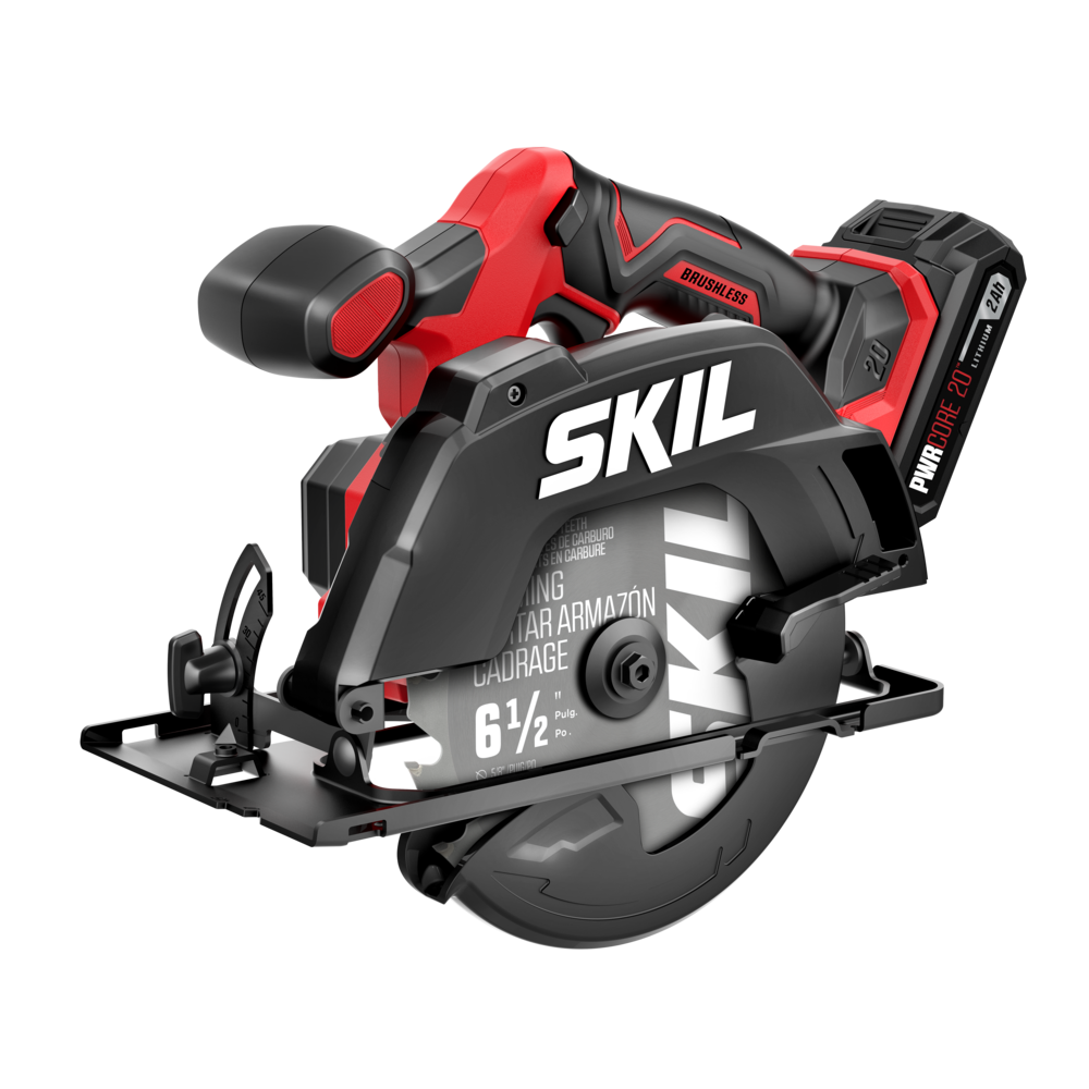 The SKIL PWRCORE 20™ Brushless 6-1/2 In. Circular Saw packs a powerful brushless motor into a compact, ergonomic design so you can power through any project. The SKIL saw features a brushless motor that delivers up to 5,500 RPM and 105 cuts in 2x4 pine on a single charge with the included PWRCORE 20™ 2.0Ah battery. It’s compact and lightweight with an ergonomic blade-left design for optimized visibility of your cut line. An LED and trace indicator create a shadow effect on your cut line for enhanced visibility while an electric brake stops the blade quickly between cuts for added safety. The compact circular saw kit includes the cordless saw, PWRCORE 20™ 2.0Ah lithium battery, 20V standard charger, 18T carbide thin kerf blade, onboard hex key, and vacuum adaptor.