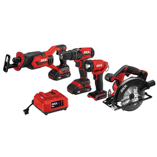 SKIL PWRCORE 20™ 4-Tool Combo Kit. All your DIY project needs are met with the SKIL 20V 4-Tool Combo Kit. Tighten screws and assemble furniture with the Cordless Drill Driver. Cut through tree branches and metal with the Reciprocating Saw. Saw through 2x4s and plywood with the Cordless Circular Saw. Shed light on your work space and dimly lit areas with the LED Spotlight. This combo kit includes two PWRCORE™ 20 2.0Ah Lithium Batteries and one 20V Charger.