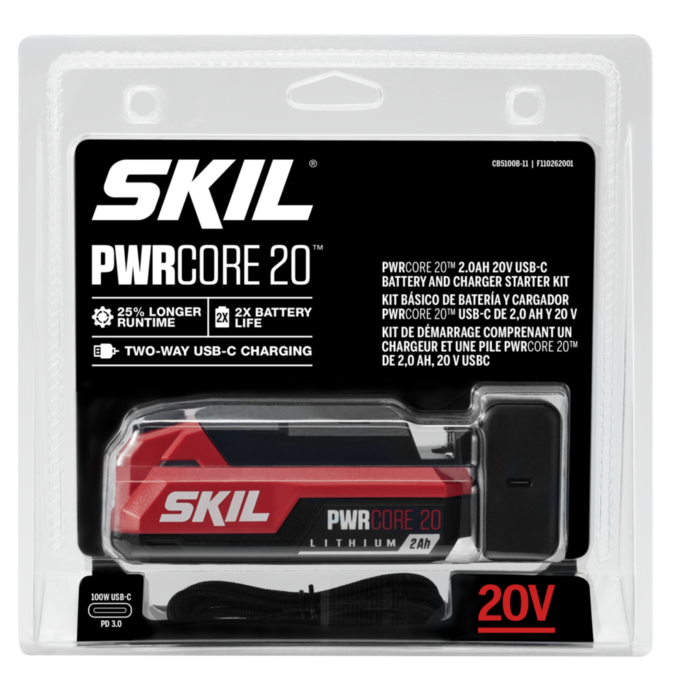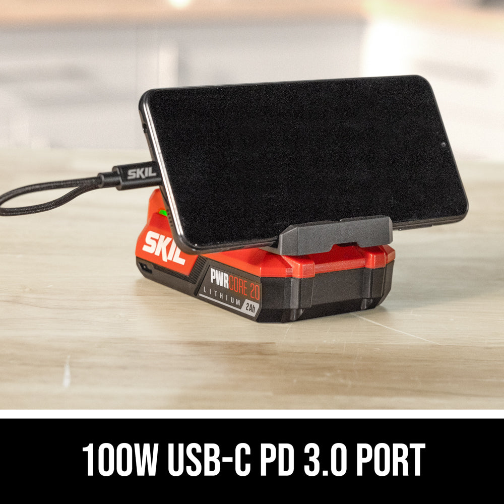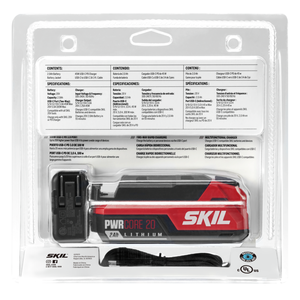 The SKIL PWRCORE 20™ Lithium 2.0Ah 20V USB-C Battery features two-way rapid charging via USB-C, allowing you to charge the battery or personal devices with its integrated USB-C port. The 100W USB-C PD 3.0 port delivers up to 20X higher power than USB-A ports to power a wide range of devices.Pulsing USB-C port LED lights indicate charging and discharging status, so you can quickly see if your USB-C port is active. The battery is 20 percent smaller than SKIL batteries with a USB-A port, and it powers any SKIL 20V tool in the PWRCORE 20™ lineup. The included multifunctional 45W Power Delivery charger charges both USB-C compatible SKIL batteries and personal devices, and will charge the 2.0Ah USB-C battery in 55 minutes.