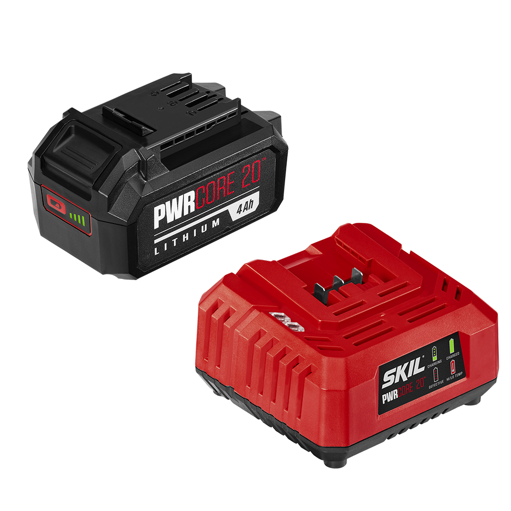 What Powers You? The SKIL PWRCORE 20™ 20V Battery and Charger Starter Kit is a good place to begin. This battery and charger combo kit includes one 20V 4.0Ah battery and one 20V Standard Charger. The 20V Standard Charger and 20V 4.0Ah battery are compatible with all SKIL 20V products. With SKIL PWRCORE 20™ lithium, industry-leading technology keeps the battery cool and powering on for 25% longer runtime. This patented battery technology also extends the battery life 2X longer. Green LEDs light up to show charge status, so you’ll always know how much charge remains.