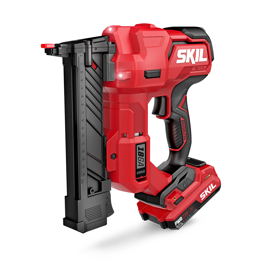 Fasten sub-floors, soffits, fencing, frames, and more quickly and securely with the SKIL PWRCORE 20™ Brushless 20V 18Ga 1/4 In. Narrow Crown Stapler. This 20V cordless stapler delivers extended runtime by driving up to 1,000 staples on a single charge with the included 2.0Ah battery. Its powerful brushless motor drives up to two staples per second with minimal ramp-up time. Dual LED lights help increase visibility when working with the battery-powered stapler in dimly lit areas. Its quick depth adjustment wheel allows you to easily set the ideal depth when driving fasteners, and the stapler is compact and lightweight for working in tight spaces with minimal fatigue. Choose between sequential and bump modes with the mode select switch. Dry fire lockout eliminates blank firing and prevents damage to work surfaces. This cordless stapler accepts fasteners with 3/8-inch to 1-1/2-inch staples with 1/4-inch crowns. The stapler kit includes the 20V cordless stapler, 2.0Ah lithium USB-C battery, 45W USB-C PD charger, (100) 18Ga 1-1/2-inch staples, belt clip, and charging cable.