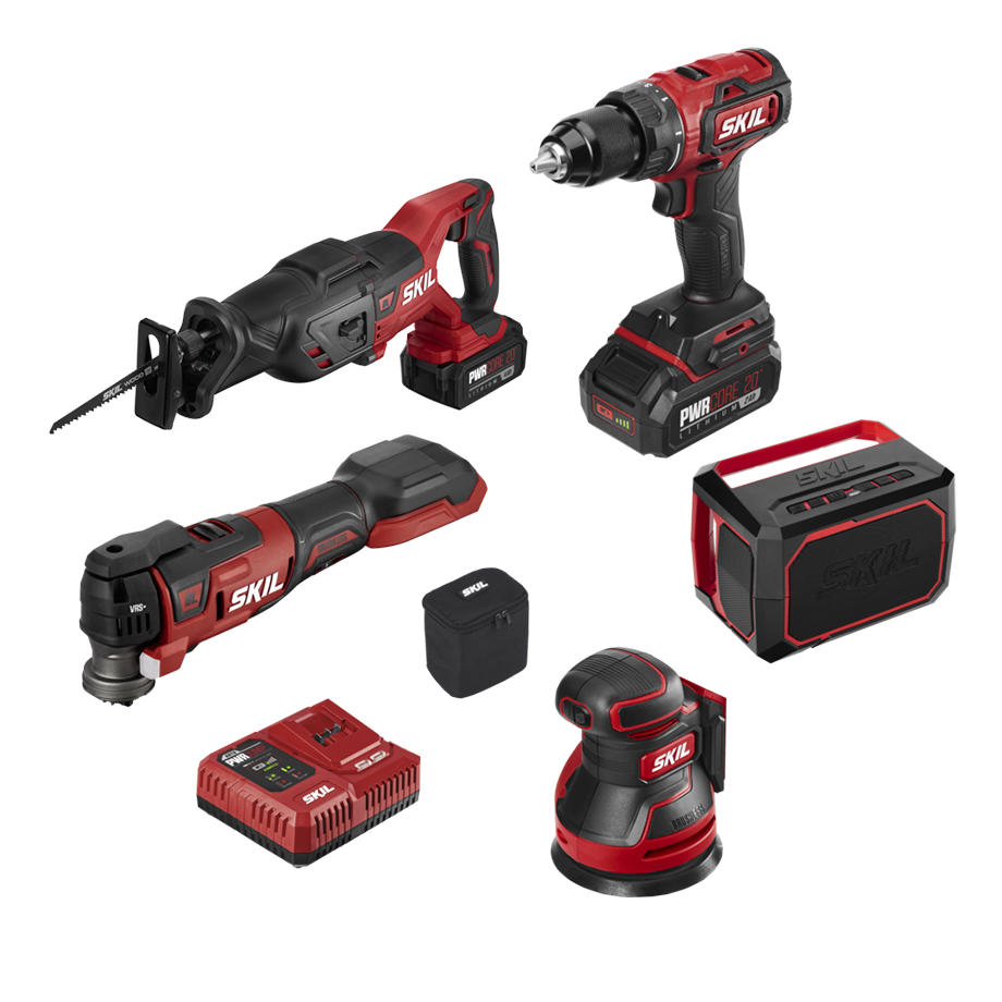 This tool combo kit includes the following PWRCORE 20™products: Drill Driver, Reciprocating Saw, Oscillating Multi Tool, Bluetooth Speaker, Sander, and Spotlight. Includes the power and performance of the SKIL 4.0Ah PWRCORE 20™ Lithium Battery with PWRASSIST™ Mobile Charging, 2.0Ah PWRCORE 20™ Lithium Battery with PWRASSIST™ Mobile Charging, and PWRJUMP™ Charger.