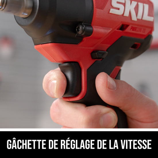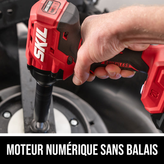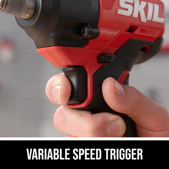 Tackle tough wheel lug nuts and suspension bolts with the SKIL 20V Brushless ½ In. Impact Wrench. The cordless impact wrench features a digital brushless motor that delivers up to 220 foot-pounds of fastening torque, 260 foot-pounds of nut-busting torque, and up to 3,350 IPM for breaking away stubborn nuts and bolts. Its 1/2-inch anvil features friction ring that allows quick and easy socket changes. Two-speed selection allows you to choose between maximizing power or control, with a variable speed trigger for greater precision. An LED worklight with pre-light and afterglow lights up your work area. The battery-powered impact wrench kit includes the 20V impact wrench, 20V 2.0Ah battery, and 20V 60W charger.