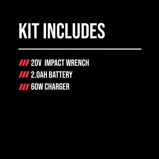 - CORDLESS IMPACT WRENCH WITH BATTERY AND CHARGER INCLUDED - Set includes the 20V cordless impact wrench, 20V 2.0Ah battery, and 20V 60W charger