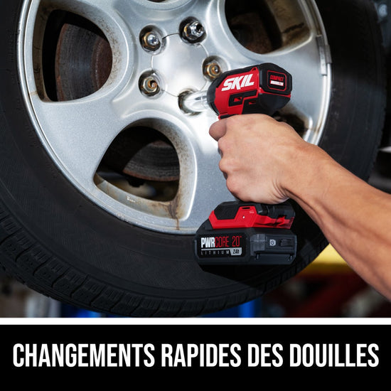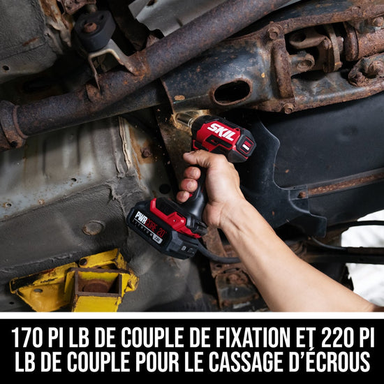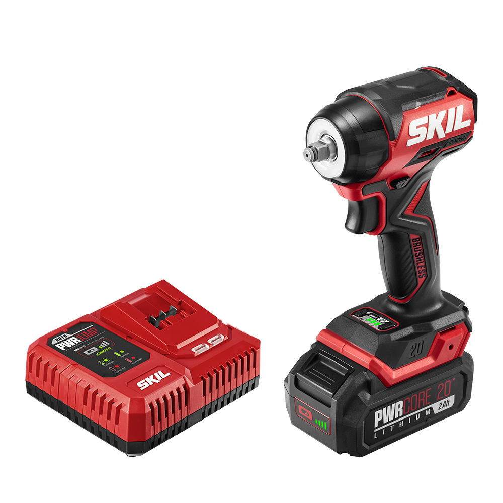 The SKIL PWRCORE 20™ Brushless 20V 3/8-inch Compact Impact Wrench gives you big power in a compact, lightweight package with up to 170 foot-pounds of fastening torque, 220 foot-pounds of nut-busting torque, and up to 3,950 IPM for driving tough nuts and bolts. At more than 1 inch shorter than its previous generation, this cordless impact wrench is an ideal power tool for working overhead or busting hard-to-reach car lug nuts and caliper bolts. Its 3/8-inch square anvil features a friction ring for easy socket changes, and its digital brushless motor combined with three-speed selection provides high-performance power and precise control. Its Halo Light™ provides 5X more light than common LEDs while reducing shadows—and it lights up your workspace for up to 10 minutes.