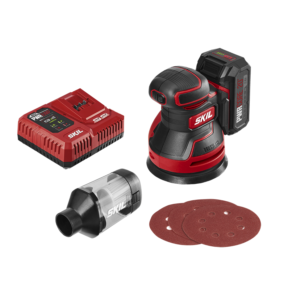 What's included: (1) SKIL PWRCORE 20™ Brushless 20V Random Orbital Sande[SR660301]; (1) SKIL PWRCORE 20™ Lithium 2.0Ah 20V Battery with PWRAssist™ Mobile Charging [BY519702]; (1) SKIL PWRCORE 20™ Auto PWRJump™ Charger[QC536001]; (1) Dust box; (5) 120 grit sandpapers