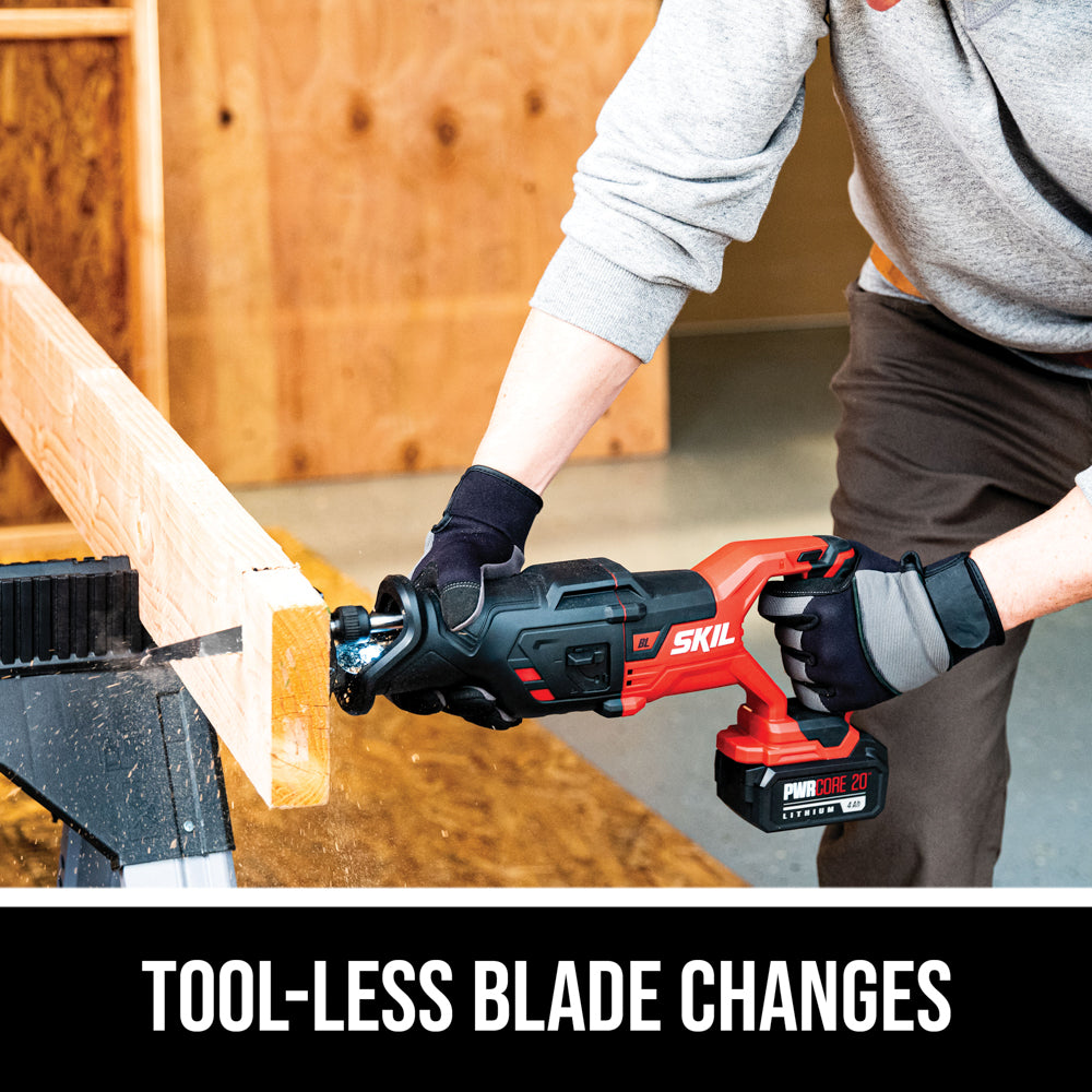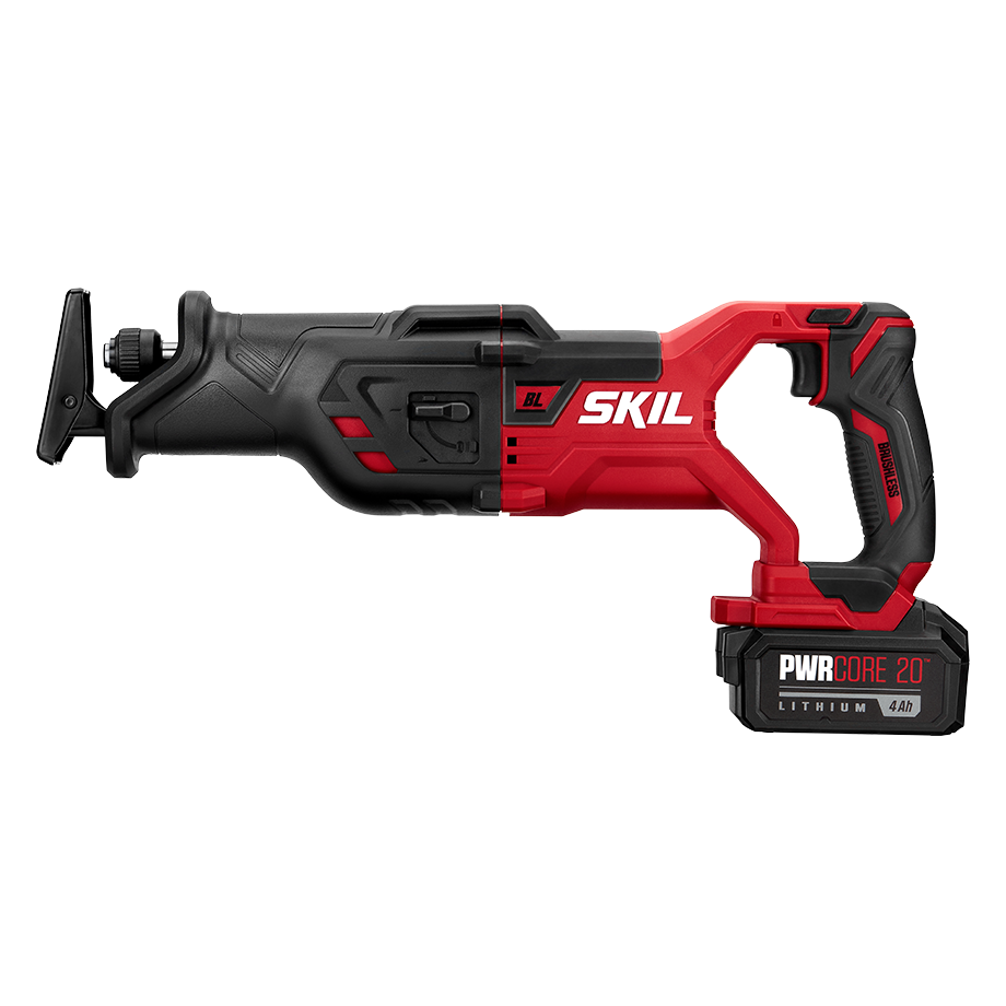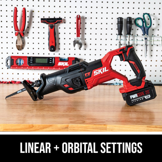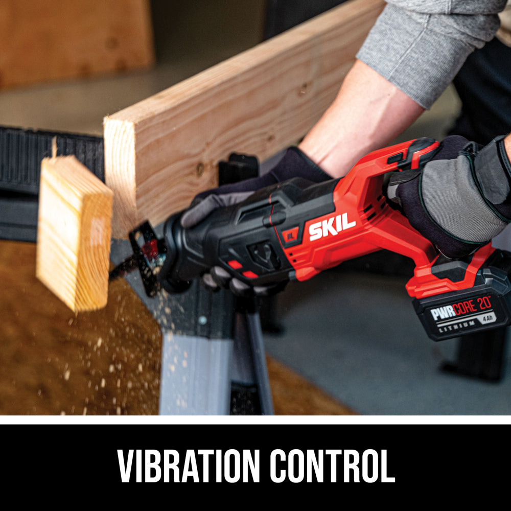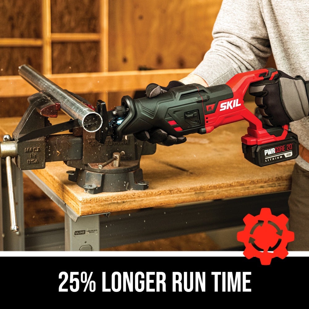 SKIL PWRCORE 20™ technology gives this battery powered electric saw power and performance. The PWRCORE 20™ Brushless 20V Reciprocating Saw efficiently and quickly cuts through wood and tough metal piping. Easily switch between linear and orbital mode, or adjust depth of cut with the pivoting shoe. Counterweights transfer less vibration, helping you work more comfortably. SKIL’s industry leading PWRCORE 20™ battery technology gives this cordless saw longer run time and battery life, so you can power through your task.