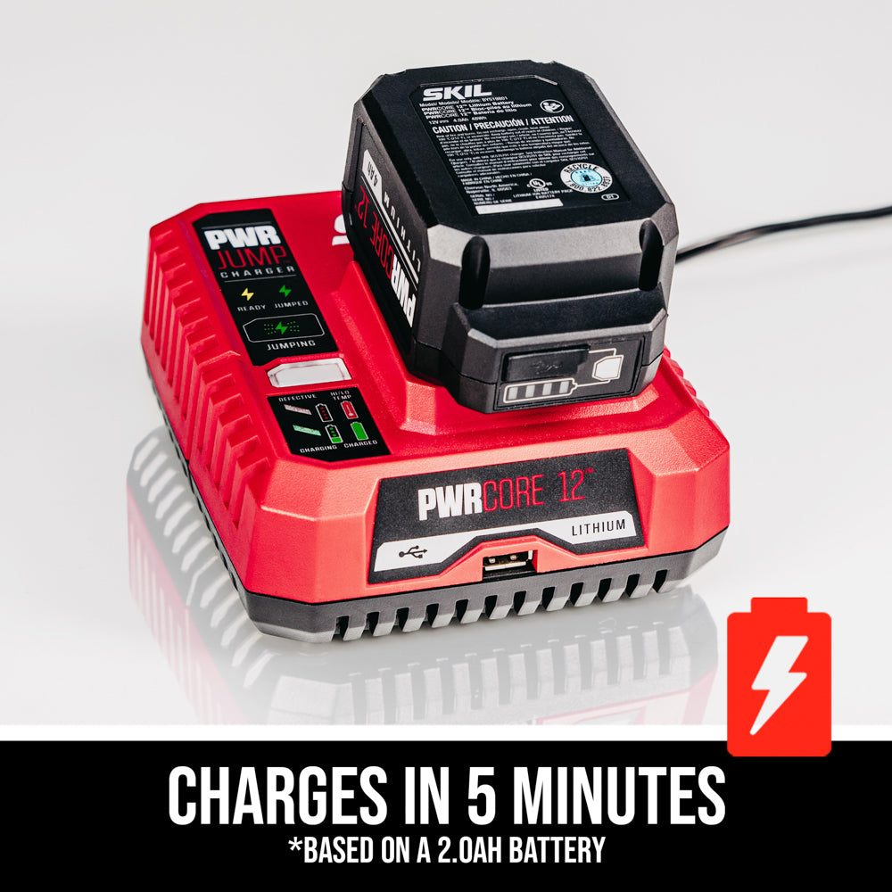 - CHARGES IN 5 MINUTES—auto PWRJUMP™ charges the battery from 0% to 25% in just 5 minutes, or 100% battery in 45 minutes (based on a 2.0Ah battery).