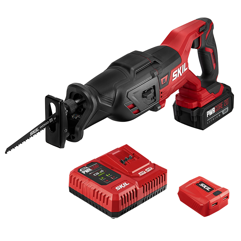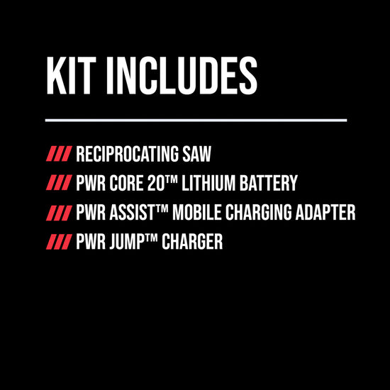 - CORDLESS SAW KIT—Reciprocating Saw comes with PWRCORE 20™ lithium battery with PWRASSIST™ Mobile Charger and PWRJUMP™ charger.