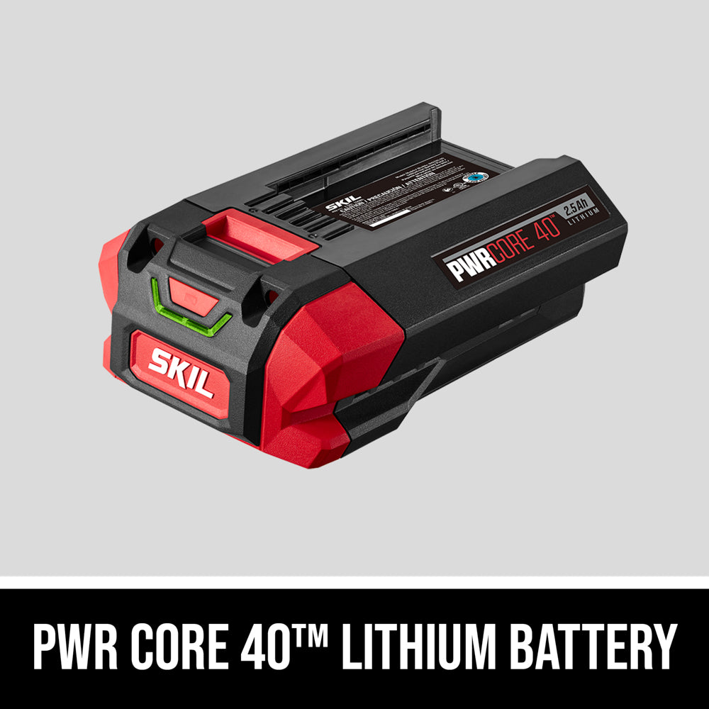 Get industry-leading performance and the power of gas in PWRCORE 40™ Lithium technology. The PWRCORE 40™ 2.5Ah Lithium Battery uses patented technology with an innovative temperature management system that results in longer run time and longer battery life. Each cell is surrounded by temperature management material to keep the battery cool and powering on. Use the SKIL 40v battery to power up all SKIL PWRCORE 40™ tools.