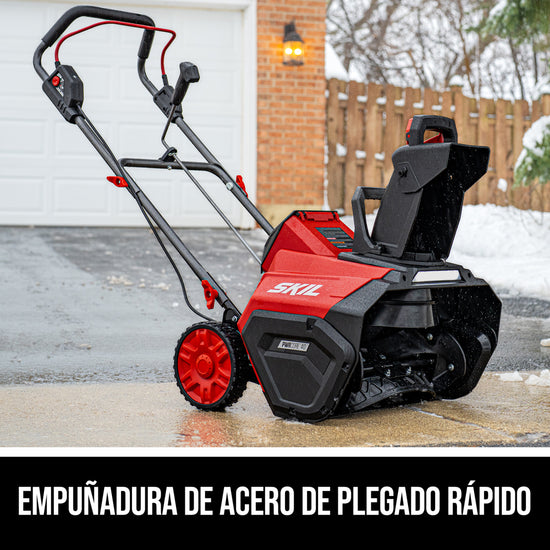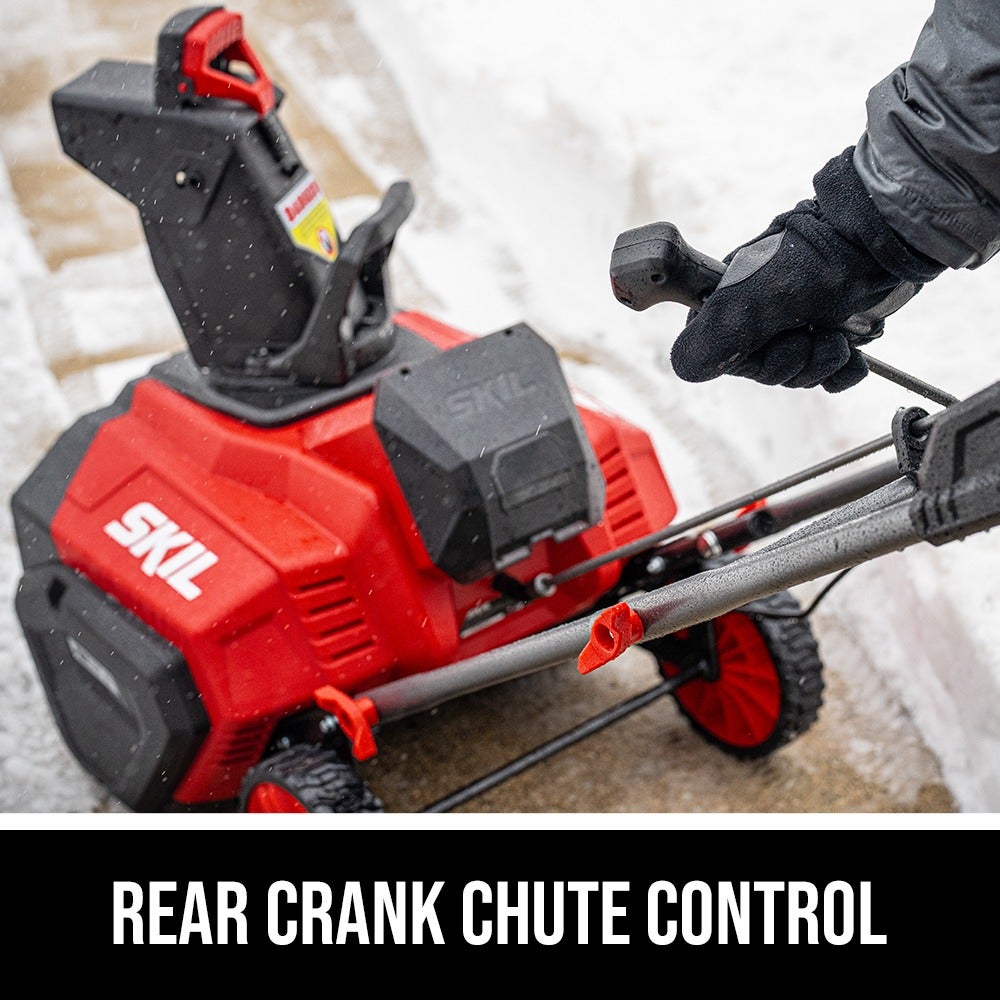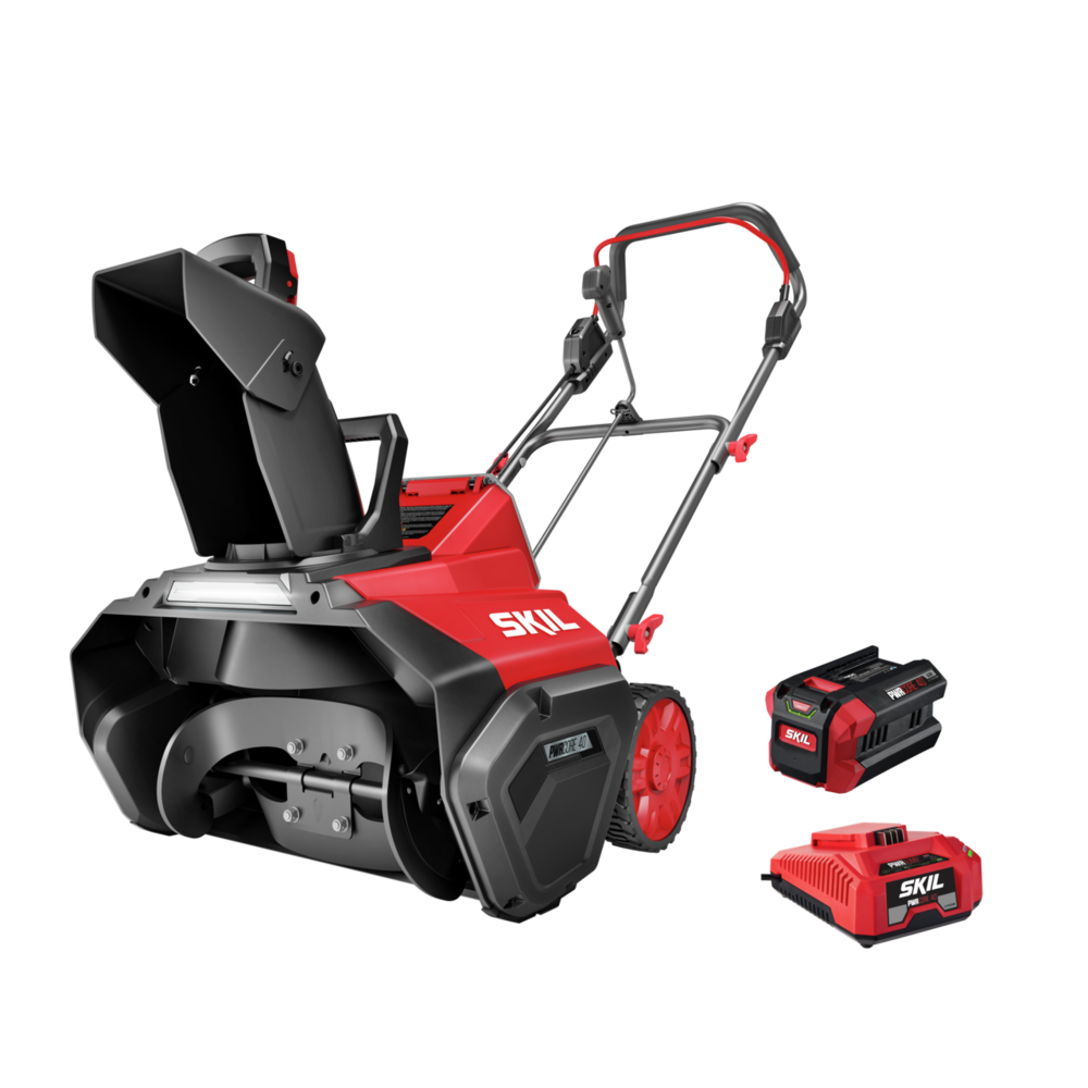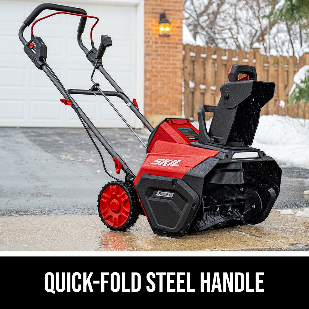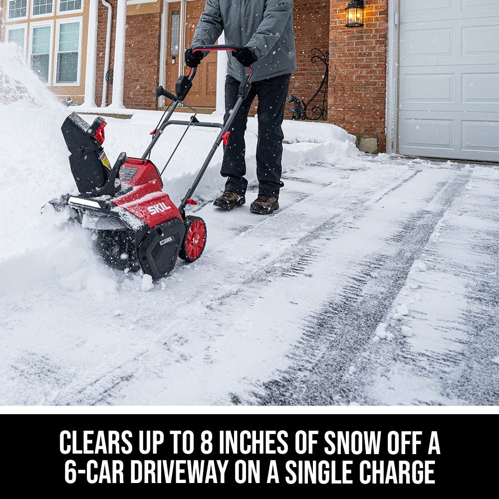 Throw snow up to 30 feet out of your way with the SKIL PWRCORE 40™ 20 In. Single Stage Snow Blower. This cordless snow blower features a digital brushless motor that delivers efficient, high-performance power for longer tool life without the hassle of gas. Rear crank chute control allows for quick and easy 180-degree chute direction changes. This battery-powered snow blower features a rubber-tipped steel auger for improved pavement cleaning and an LED headlight improves visibility in low light conditions. Its quick-fold steel handle allows for easy, compact storage when not in use and between seasons. This cordless snow blower kit includes the 40V single stage snow blower, PWRCORE 40™ 6.0Ah battery, and a PWRCORE 40™ Auto PWRJUMP™ charger.