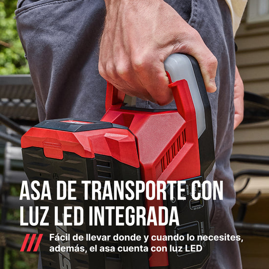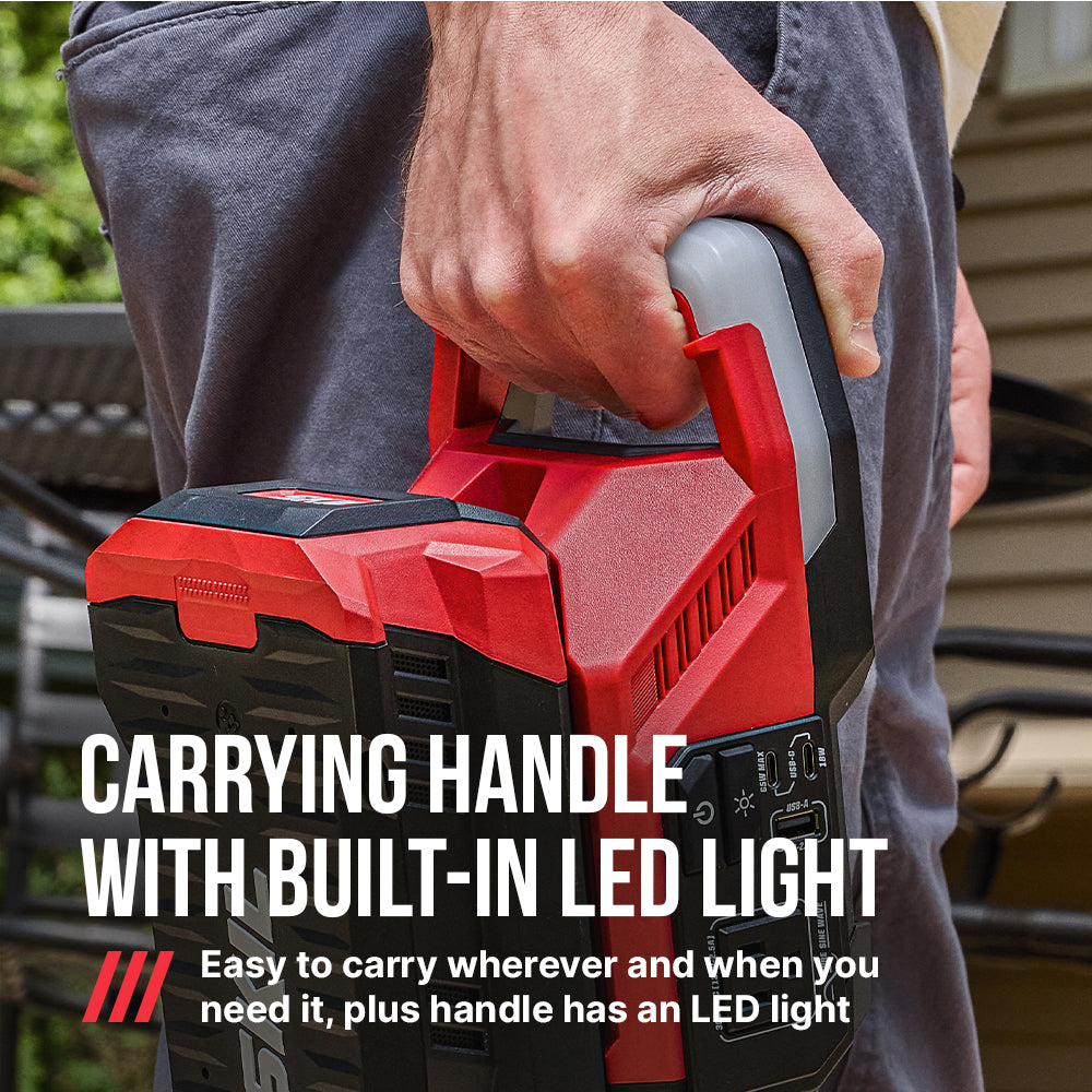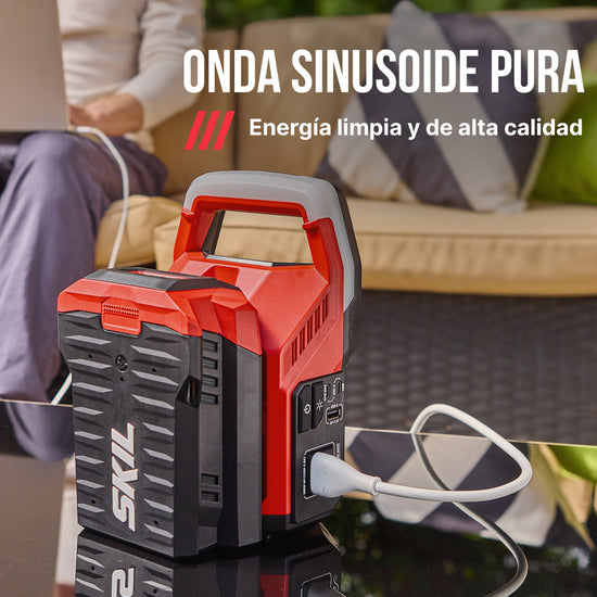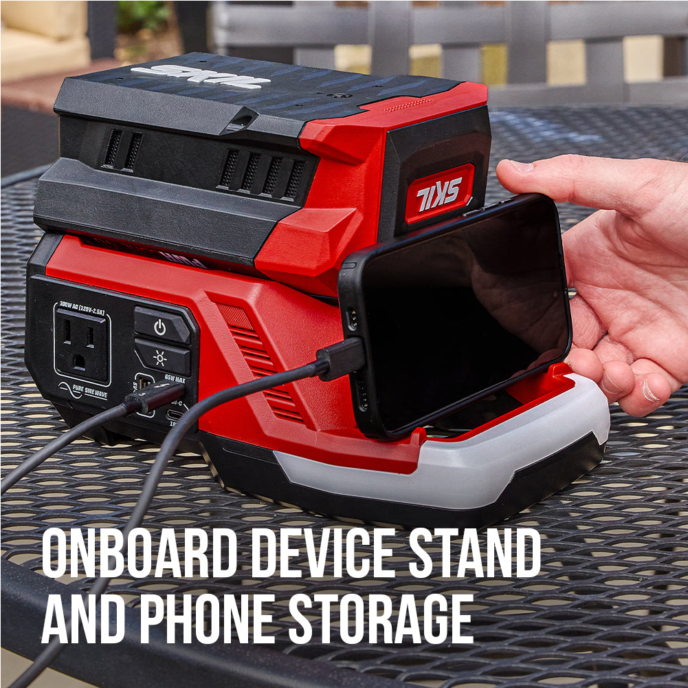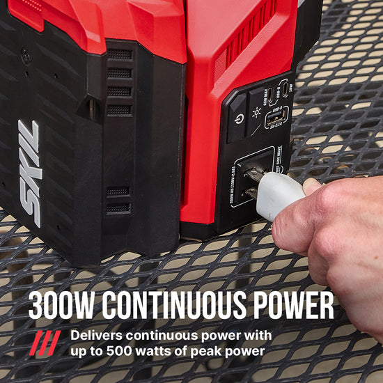 Bring power anywhere with the SKIL PWRCORE 40™ 40V 300W Inverter. The cordless power inverter delivers 300 watts of continuous power with up to 500 watts of peak power. The 300W inverter simultaneously powers up to four devices via its standard 120V outlet or USB-A, USB-C, and 65W USB-C PD out ports. Bring it camping or to a tailgate party to power a slow cooker or a portable speaker or use it during a power outage to plug in phones, laptops, or your TV. Pure sine wave delivers high-quality, clean power to sensitive electronics. An LED with two brightness settings is built into the convenient carrying handle for bringing power anywhere. Prop up small devices with the power inverter’s onboard stand or store a mobile device in the phone pocket. The inverter is compatible with all SKIL PWRCORE 40™ batteries (sold separately).
