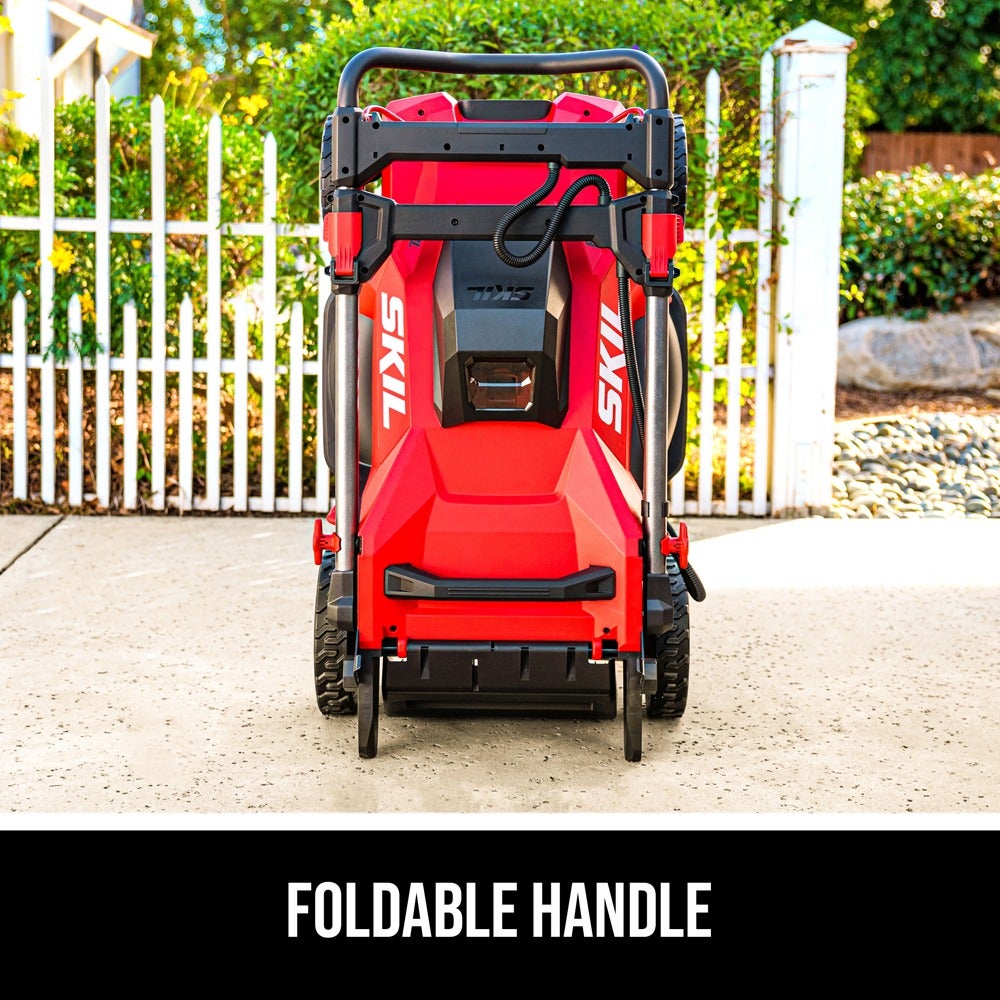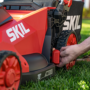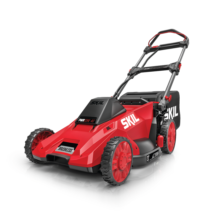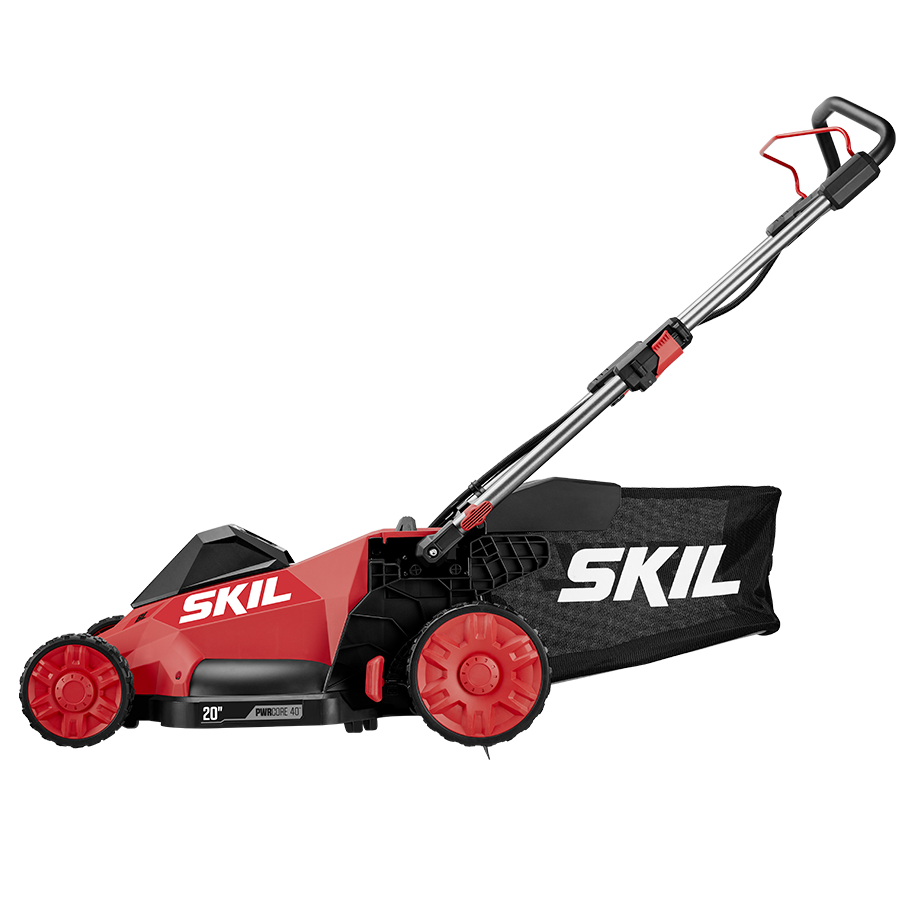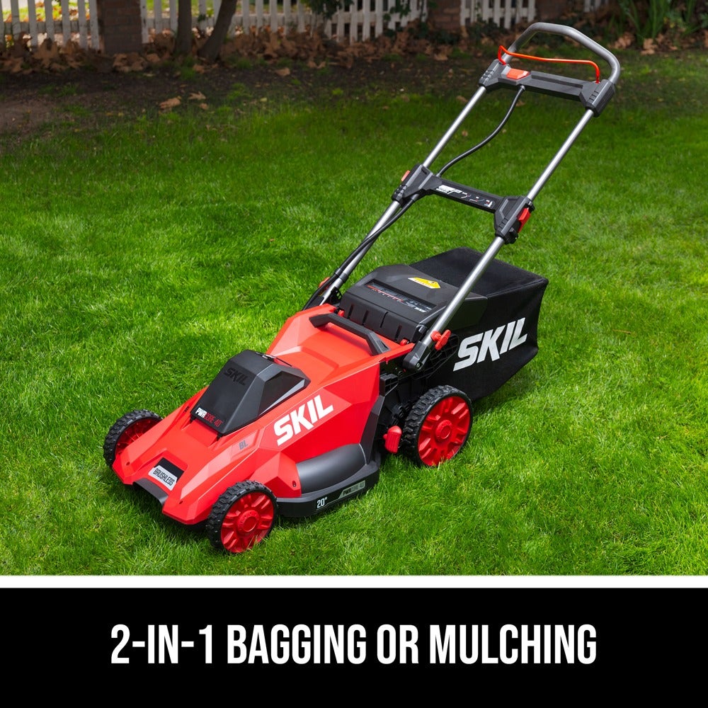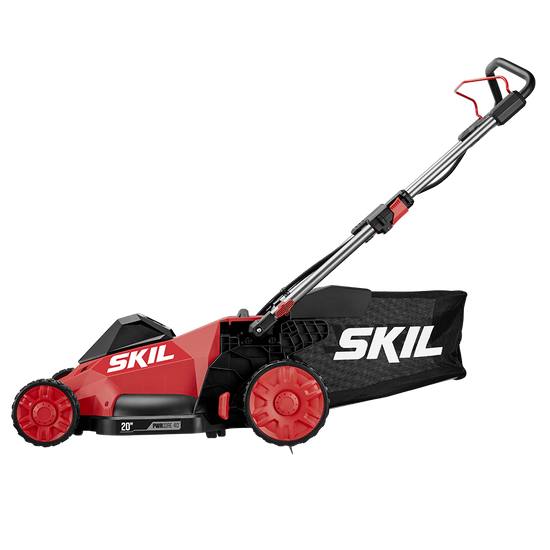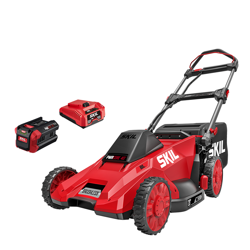 Ditch the gas for a smarter lawn care solution with the SKIL 40V Brushless 20 In. Push Mower. The cordless lawn mower features a convenient push-button start and load-sensing technology for optimized cutting performance. Change cutting heights quickly and easily across seven settings between 1.25 and 4 inches with a single lever. Choose between bagging or mulching with 2-in-1 functionality and the included 1.7 bushel grass bag and mulch plug. When you’re finished cutting, the cordless push mower features a telescoping handle that folds for convenient vertical storage. The cordless lawn mower kit features the 40V push mower, 40V 6.0Ah battery, Auto PWRJUMP™ charger, mulch plug, and grass bag.