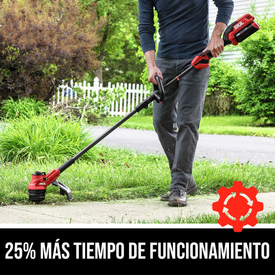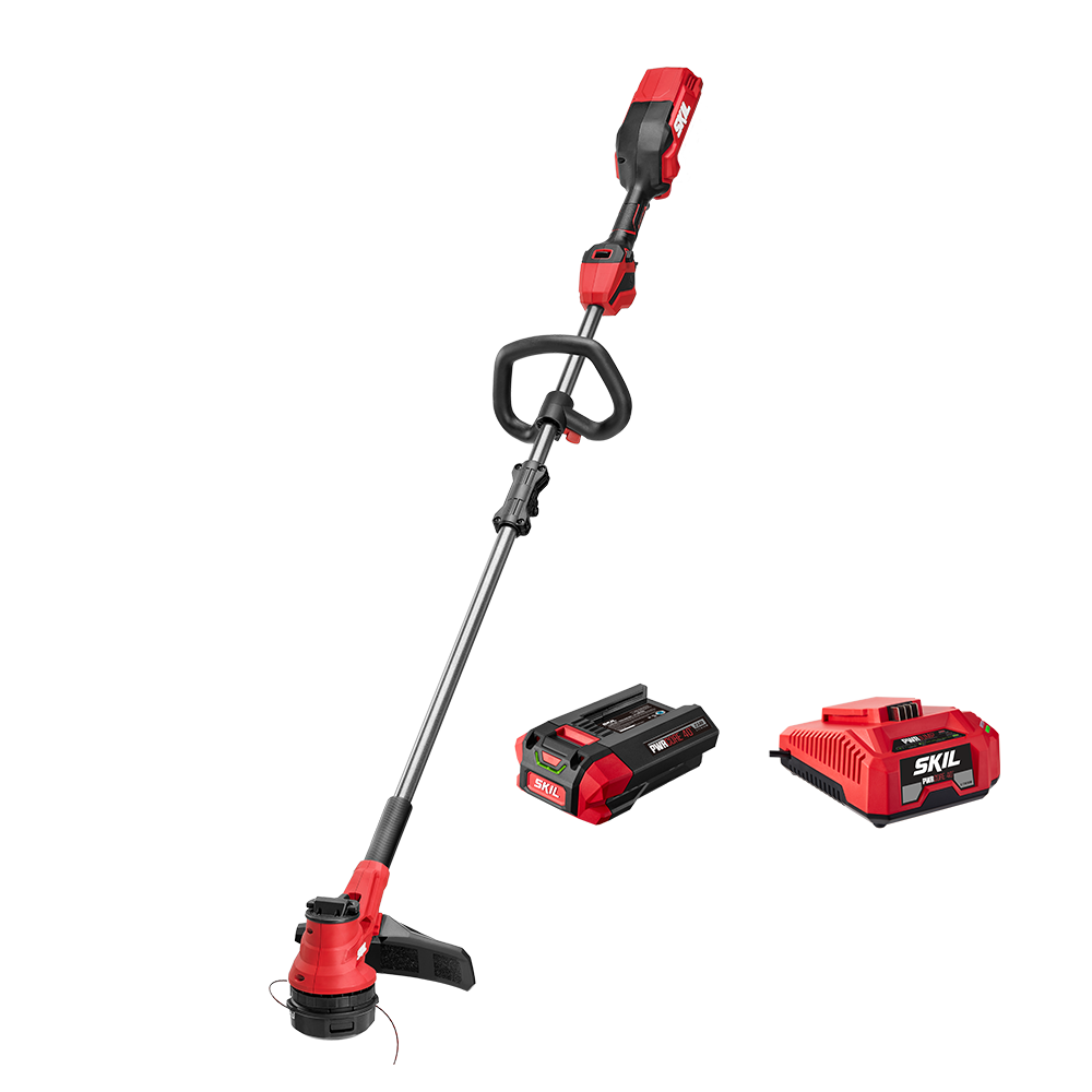 The SKIL PWR CORE 40™ Brushless 40V 15 In. String Trimmer with Smart Load™ is made for performance, efficiency, and ease of use, handling everything from light trimming to tackling the toughest grass and weeds. Its digital brushless motor and PWR CORE 40™ lithium battery technology deliver the power to cut through thick grasses and weeds with ease. The 15-inch cutting swath on this electric string trimmer ensures you can trim quickly and efficiently, and its two-speed selector allows you to choose between maximizing power or runtime. Simply tap the dual-line bump feed head on the ground to release more line and continue working. When the 0.080-inch line needs to be replaced, this cordless trimmer features an innovative Smart Load™ head that allows fast, easy line loading with a simple crank. Level up your lawn care game—without the hassle of gas—with a cordless string trimmer built for performance, efficiency, and ease of use. String trimmer kit includes a PWR CORE 40™ 2.5Ah battery and Auto PWR JUMP™ charger.