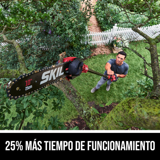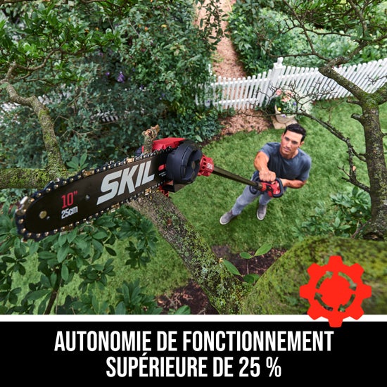 Get industry-leading performance with a cordless pole saw powered by SKIL PWRCORE 40™ lithium technology. Add more power and durability to your tool shed with a telescopic electric pole saw powered by a digital brushless motor. The lightweight telescopic aluminum shaft extends from 7.5-10 feet in length, while the 10” bar & chain angled head provides greater control for the hardest to reach jobs. This tree pruner features an auto lubricating chain to reduce friction and enhance durability, while tool-less chain tensioning allows for hassle-free adjustments. This Pole Saw kit includes a PWRCORE 40™ 2.5Ah 40V Battery and an Automatic PWRJUMP™ Charger.
