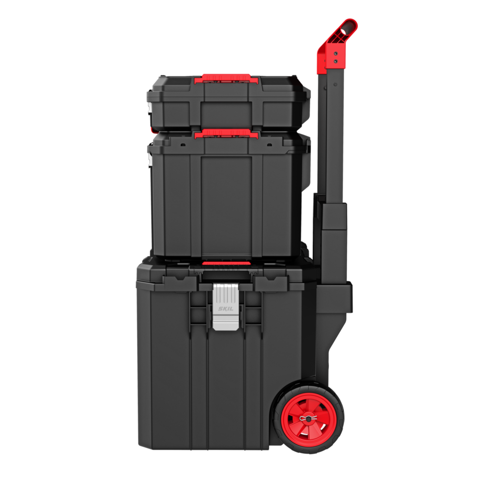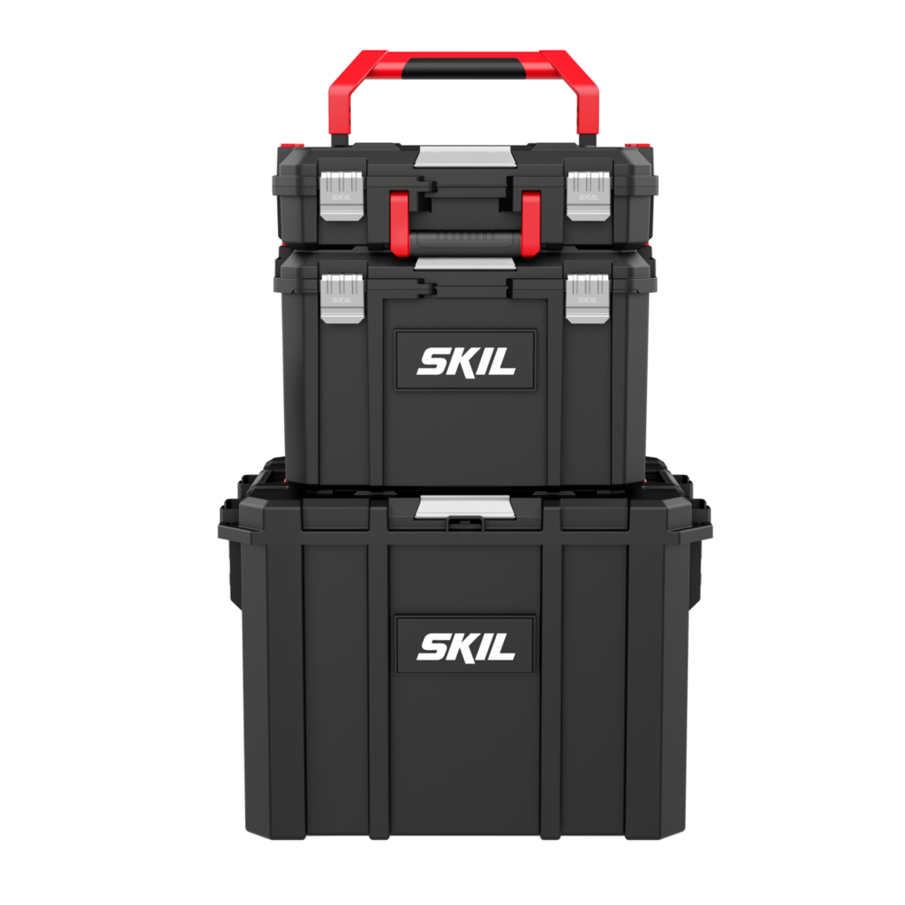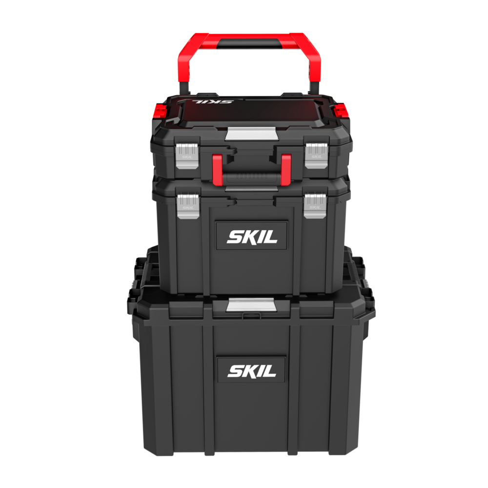 Easily store and transport your tools and accessories with the SKIL Rolling Tool Box 3-Piece Tower Set featuring a rolling storage box with removable handle, a medium box with hand tool rack, and a suitcase-style toolbox. Each piece in the set features stackable interlocking latches for easy and secure stacking and customizable setups. The rolling storage box features an integrated easy rack design so you can hang your tools or compatible accessory bins for quick access when you’re working. The medium box includes an accessory bin with dividers along with a hand tool rack to easily organize and store your hand tools. Easily store your rolling storage case in the bed of a truck with its cover closed thanks to its removable rear handle. IP54 protection shields your tools and accessories from the elements and a security padlock hole delivers added theft protection.