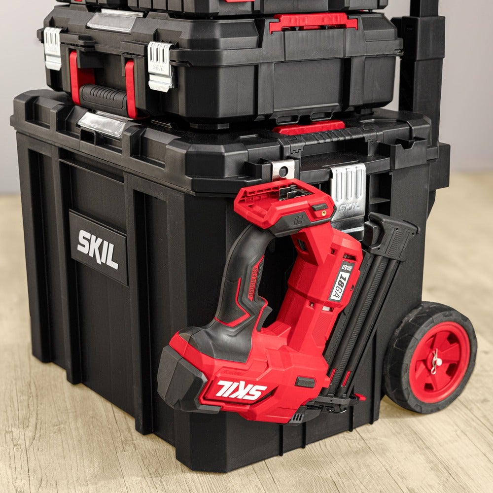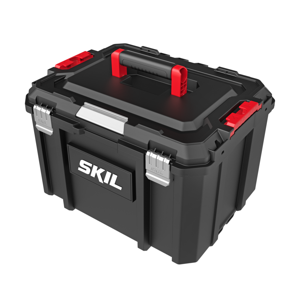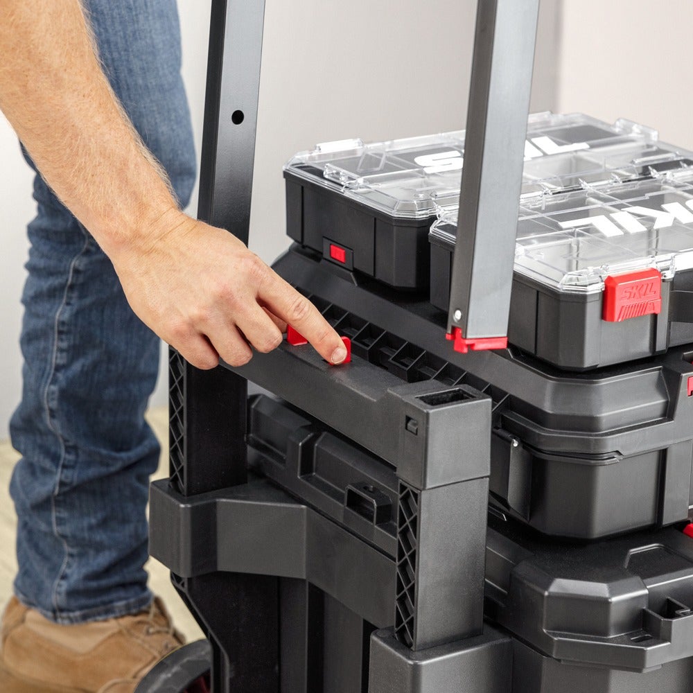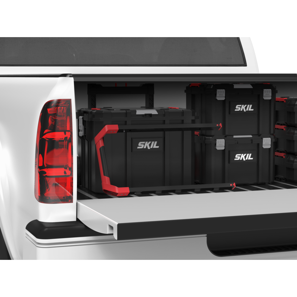 Easily store and transport your tools and accessories with the SKIL Rolling Tool Box 3-Piece Tower Set featuring a rolling storage box with removable handle, a medium box with hand tool rack, and a suitcase-style toolbox. Each piece in the set features stackable interlocking latches for easy and secure stacking and customizable setups. The rolling storage box features an integrated easy rack design so you can hang your tools or compatible accessory bins for quick access when you’re working. The medium box includes an accessory bin with dividers along with a hand tool rack to easily organize and store your hand tools. Easily store your rolling storage case in the bed of a truck with its cover closed thanks to its removable rear handle. IP54 protection shields your tools and accessories from the elements and a security padlock hole delivers added theft protection.