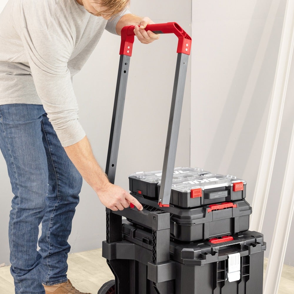 - STORAGE SET INCLUDES - (1) rolling storage box with removable handle, (1) suitcase style toolbox, (1) medium box with hand tool rack, (1) accessory bin with dividers