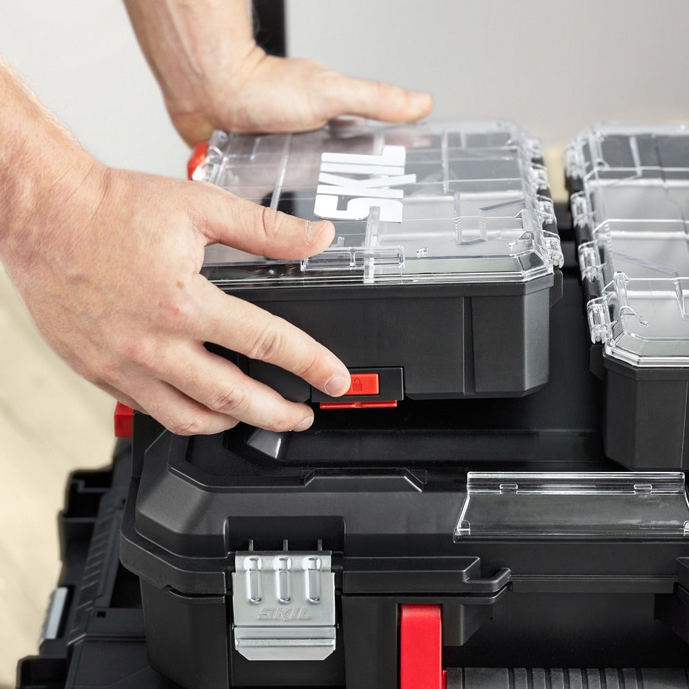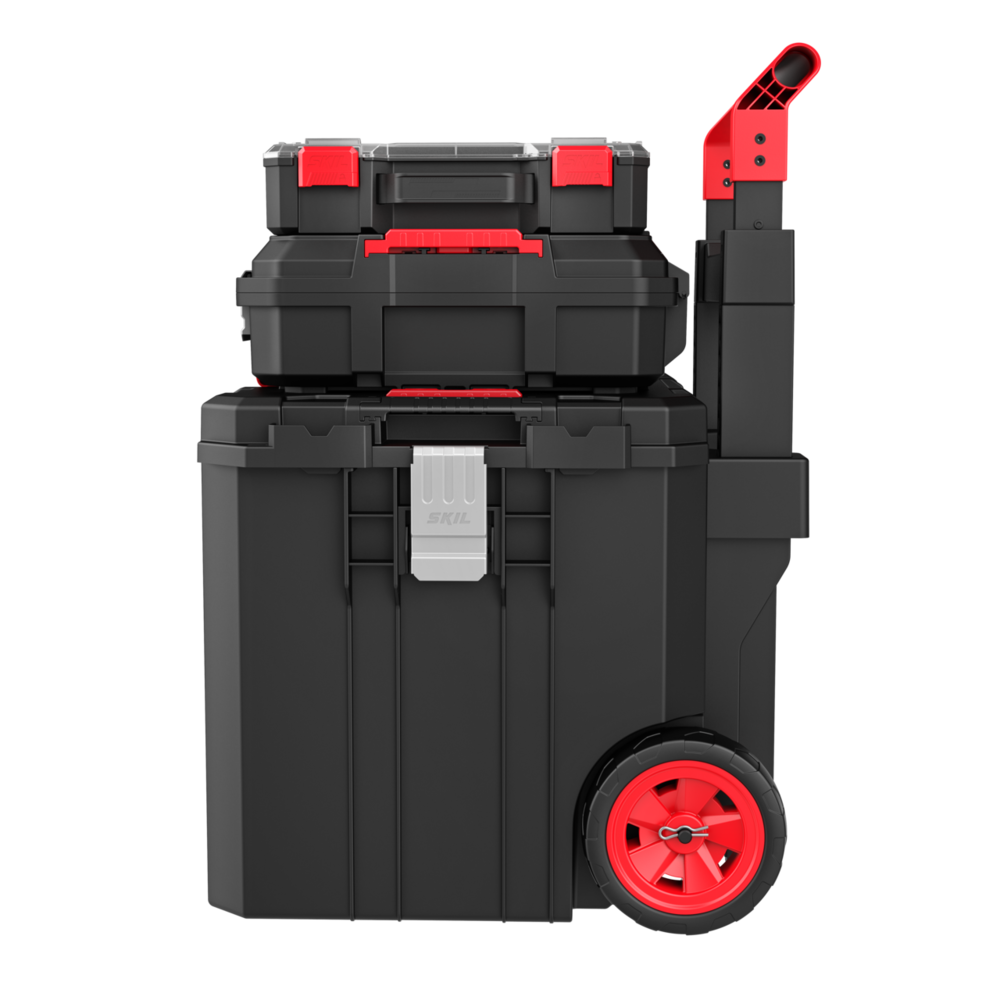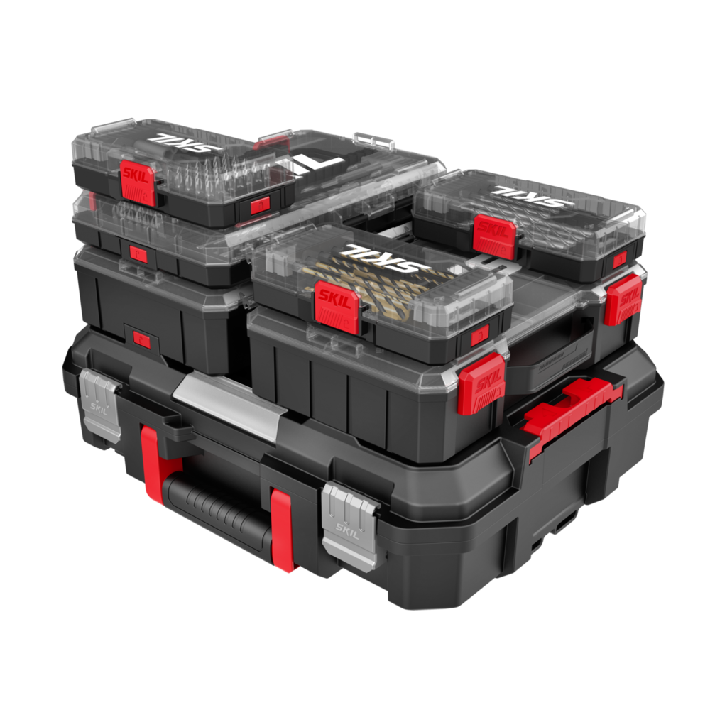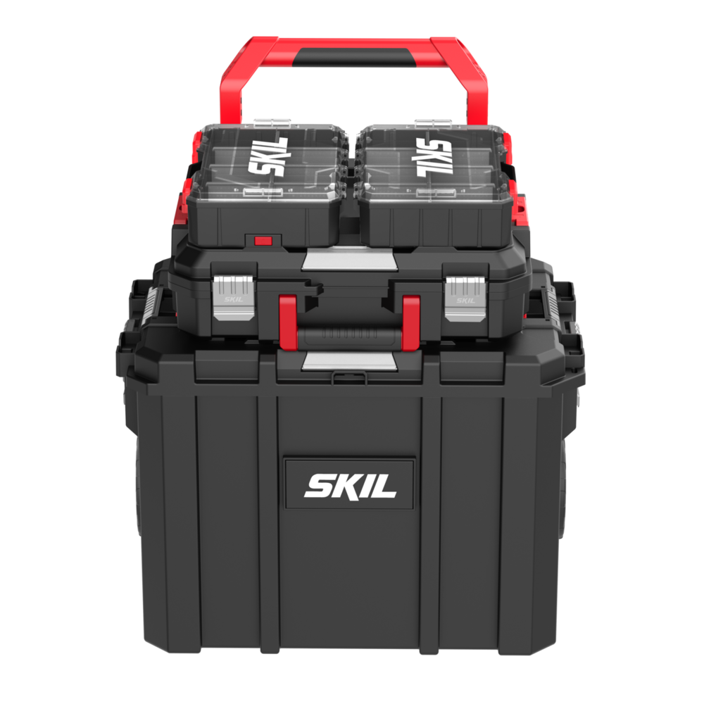 Easily store and transport your tools and accessories with the SKIL Rolling Tool and Organizer Box 4-Piece Tower Set featuring a rolling storage box with removable handle, a suitcase-style toolbox, and two compact organizers. Each piece in the set features stackable interlocking latches for easy and secure stacking and customizable setups. The compact organizers feature bit case connectivity for added storage options for your SKIL bit and blade cases. The rolling storage box features an integrated easy rack design so you can hang your tools or compatible accessory bins for quick access when you’re working. Easily store your rolling storage box in the bed of a truck with its cover closed thanks to its removable rear handle. IP54 protection shields your tools and accessories from the elements and a security padlock hole delivers added theft protection (rolling storage box and suitcase only).