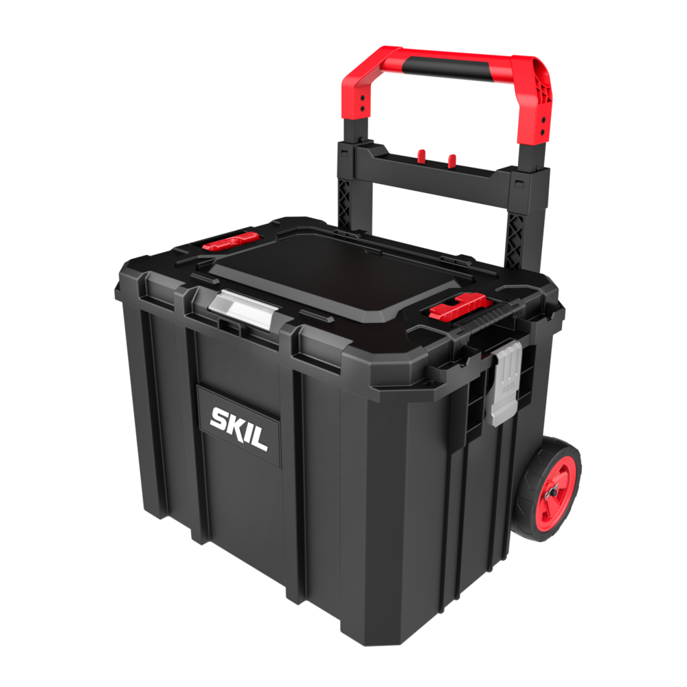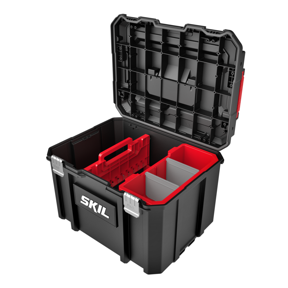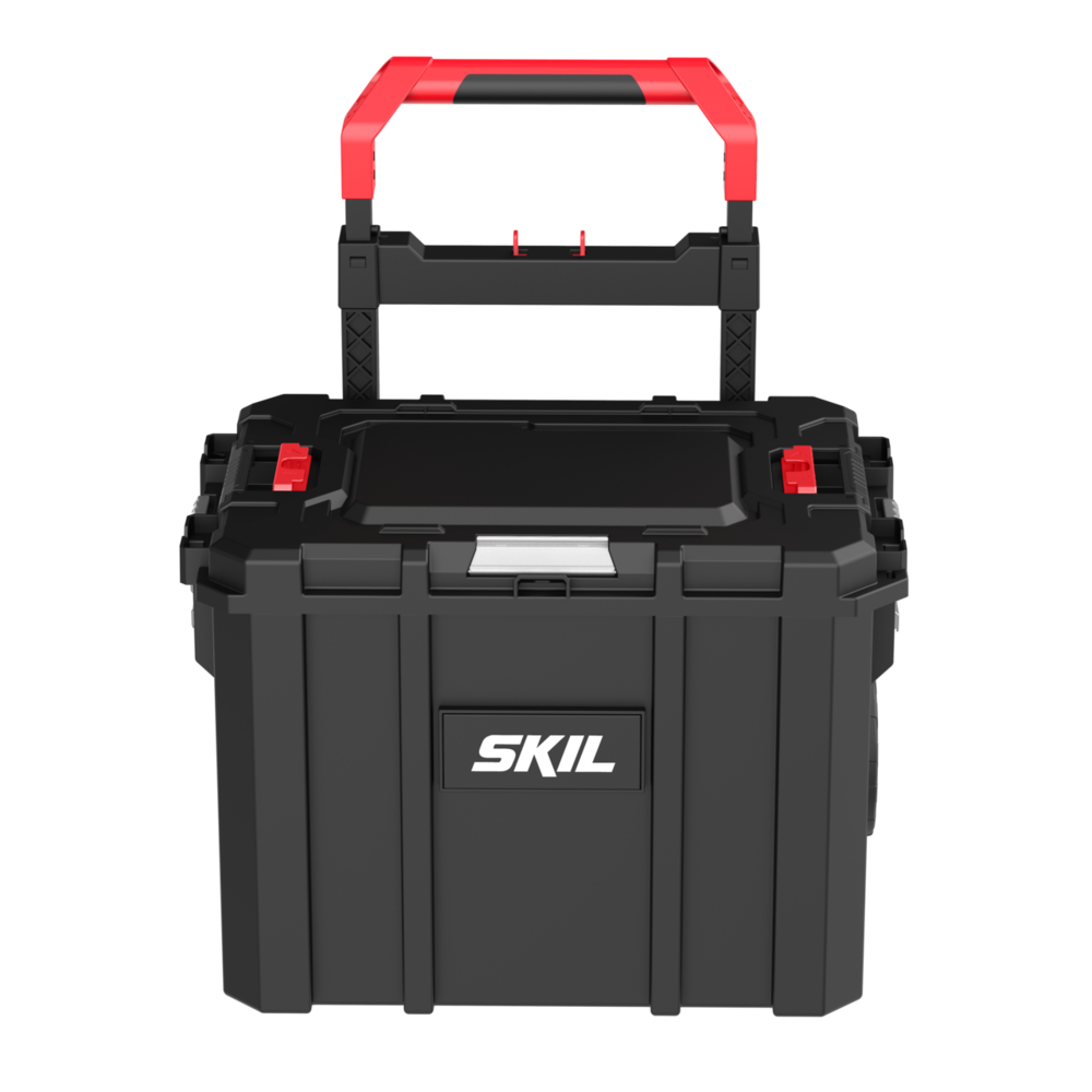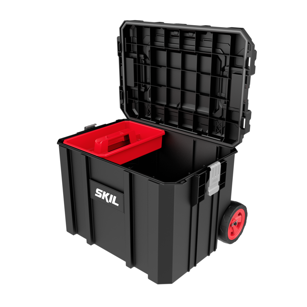 Easily store and transport your tools and accessories with the SKIL Rolling Tool and Organizer Box 4-Piece Tower Set featuring a rolling storage box with removable handle, a suitcase-style toolbox, and two compact organizers. Each piece in the set features stackable interlocking latches for easy and secure stacking and customizable setups. The compact organizers feature bit case connectivity for added storage options for your SKIL bit and blade cases. The rolling storage box features an integrated easy rack design so you can hang your tools or compatible accessory bins for quick access when you’re working. Easily store your rolling storage box in the bed of a truck with its cover closed thanks to its removable rear handle. IP54 protection shields your tools and accessories from the elements and a security padlock hole delivers added theft protection (rolling storage box and suitcase only).