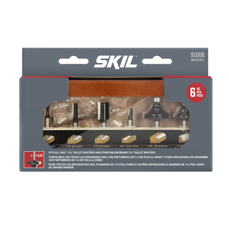 Set includes 3 straight bits, roundover bit, roman ogee bit, corebox bit and replacement bearing and hex key.
