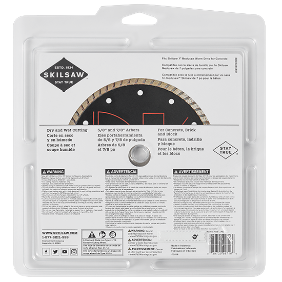 Make fast, clean cuts on tough concrete, brick and blocks. A segmented diamond-reinforced edge with heavy duty metal construction provides durability. Can be used for dry and wet cutting. Pairs with the SKIL 7 IN. Concrete Worm Drive Saw and other concrete cutting tools.