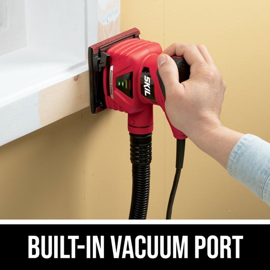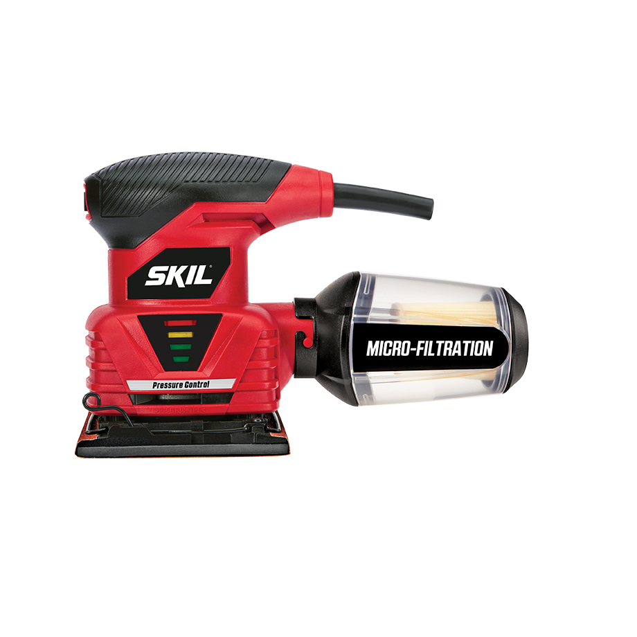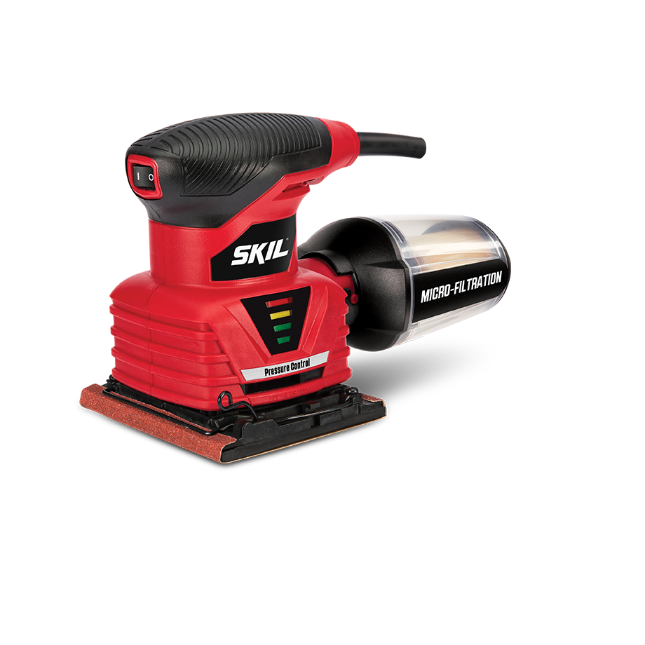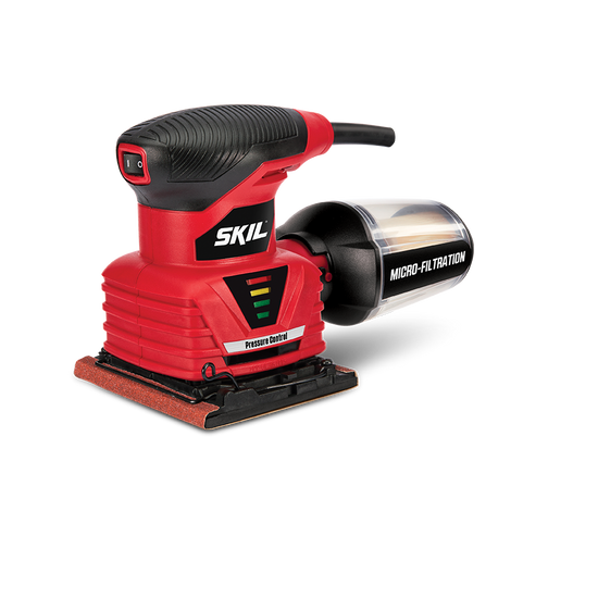 The SKIL Sheet Palm Sander is the perfect tool for faster stock removal and smooth results when you're putting the finishing touch on your project. The pressure control indicator lets you know when the right amount of pressure is applied and warns you when there's too much. The pad brake eliminates gouging. Micro-filtration captures and contains fine dust particles to keep your work surface cleaner. A sealed switch keeps dust out of the tool for a long life. The dust canister is clear, removing the guess work of figuring out when to empty it.