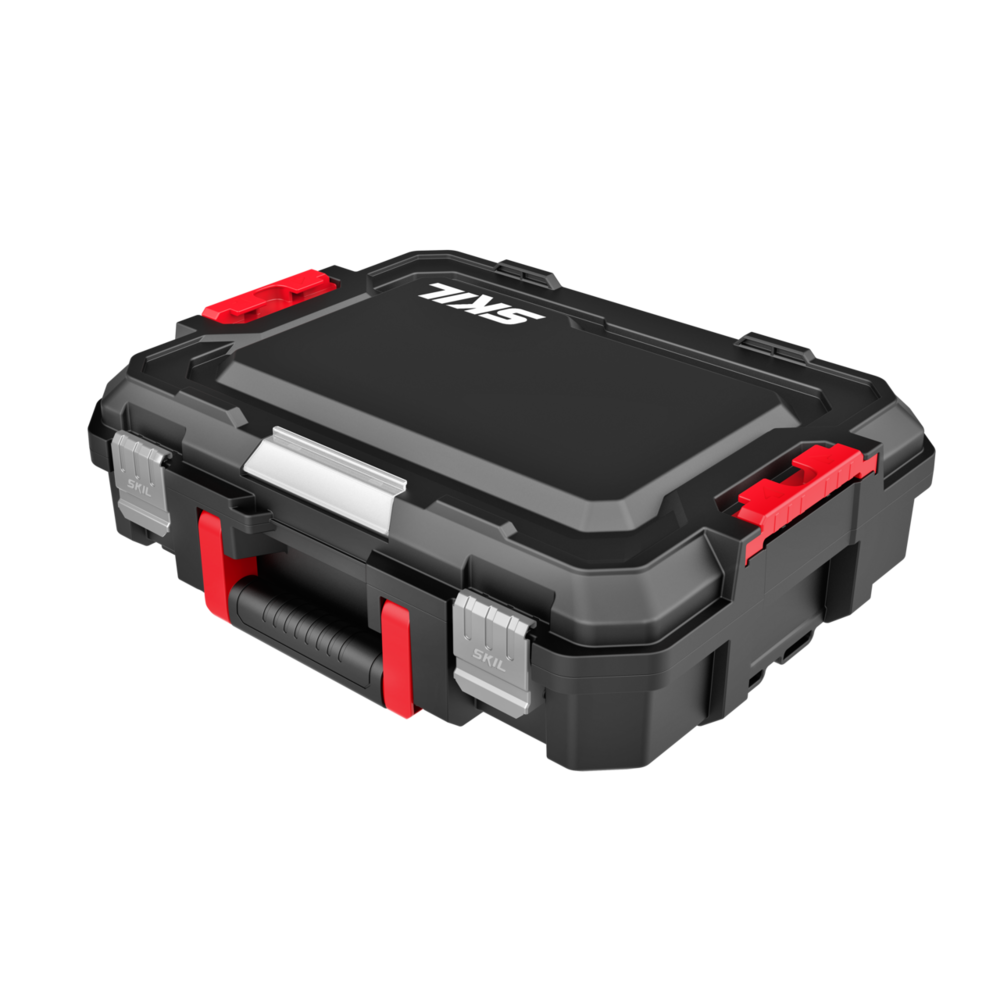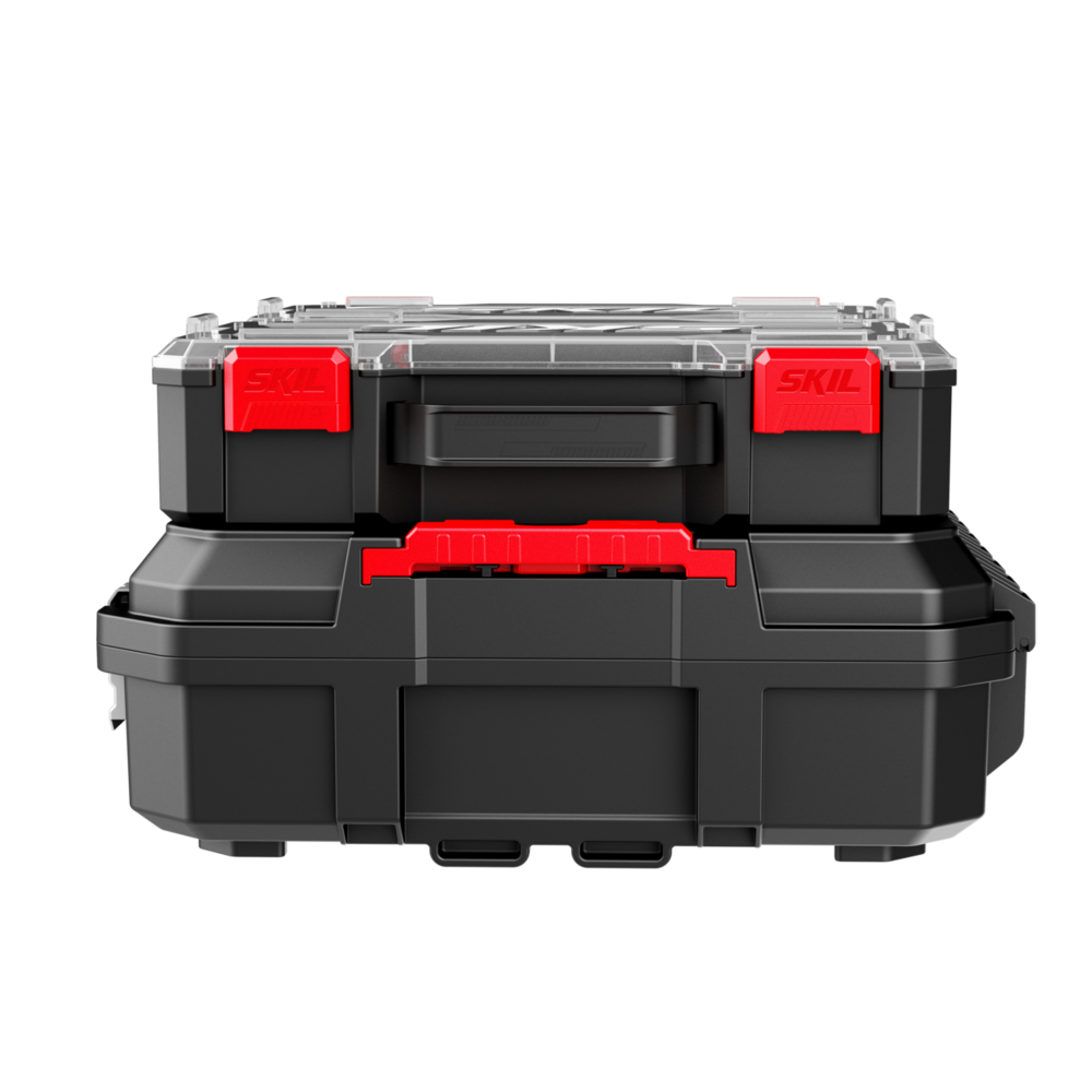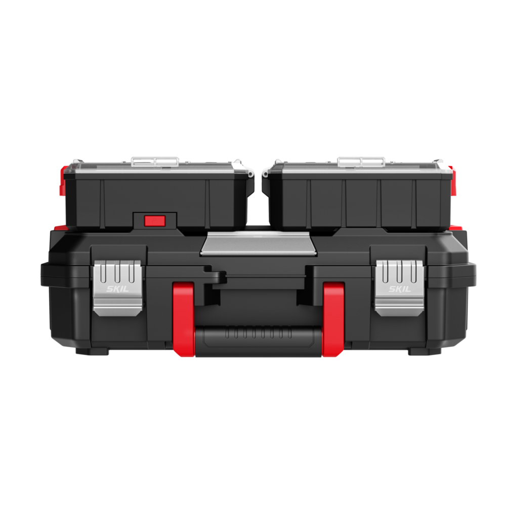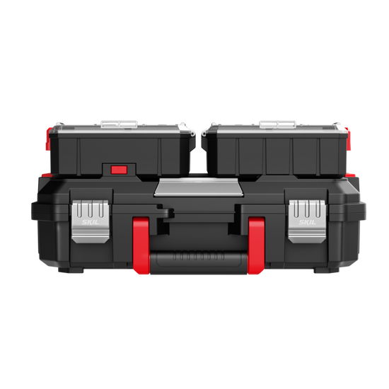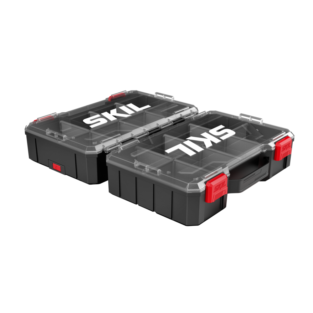 Easily store and transport your tools and accessories with the SKIL Suitcase and Organizer Box 3-Piece Set featuring a suitcase-style toolbox and two compact organizers with removable dividers. Each piece in the set features stackable interlocking latches for easy and secure stacking and customizable setups. The compact organizers feature bit case connectivity for added storage options for your SKIL bit and blade cases. The compact organizers also come with removable dividers for custom organization of parts and accessories. IP54 protection shields your tools and accessories from the elements and a security padlock hole delivers added theft protection (suitcase-style toolbox only).