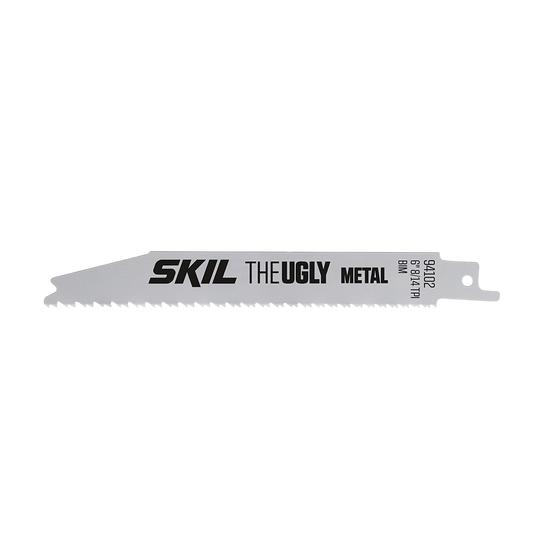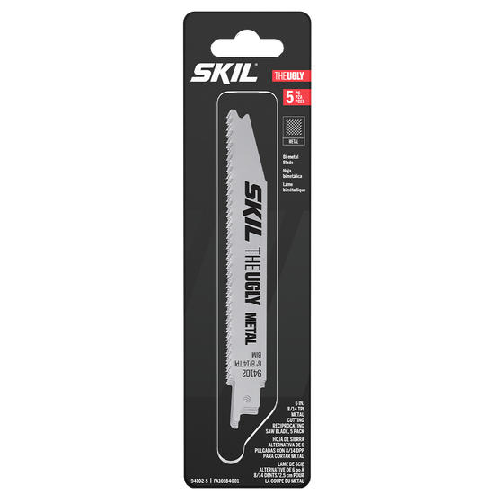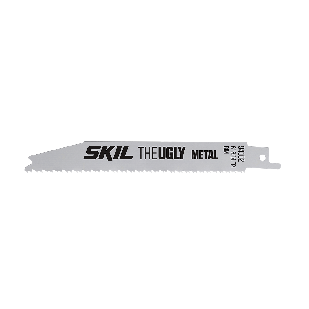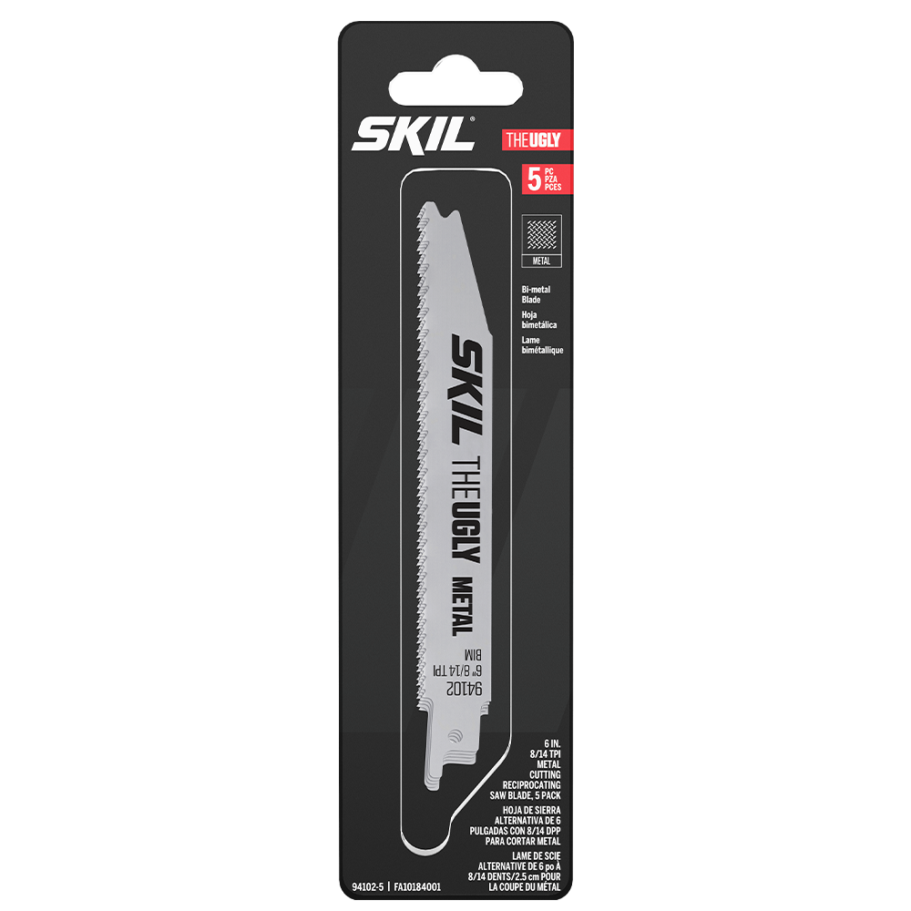 Power through metal, pipe, brackets, steel studs, and more with SKIL's The UGLY 6-Inch 8/14 TPI Metal Cutting Reciprocating Saw Blade 5-Pack. This 6-inch reciprocating saw blade features a patented progressive tooth design for consistent cutting through various stock including thick and thin metals. Its plunge body is optimized for demolition with teeth designed to enter and cut through surfaces with ease. Its reinforced solid shank construction absorbs the stress of cutting through hard metals to reduce breakage and extend the life of this reciprocating saw blade.