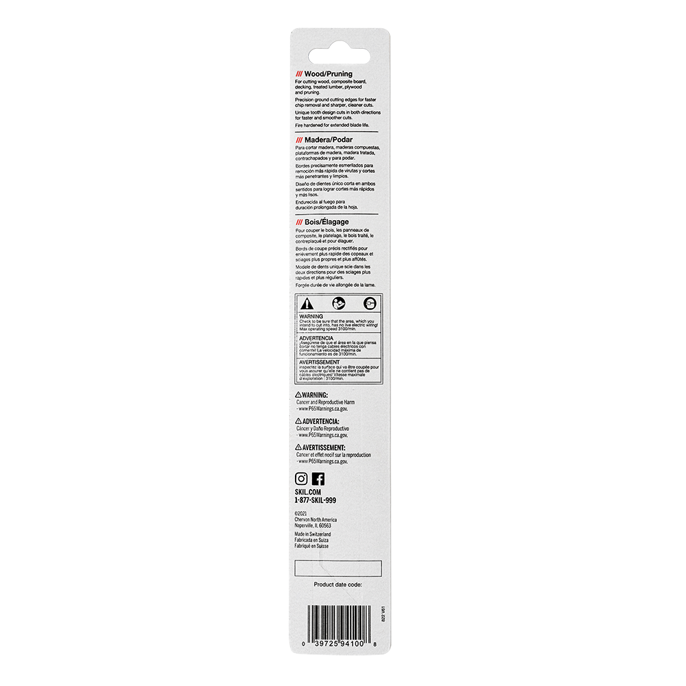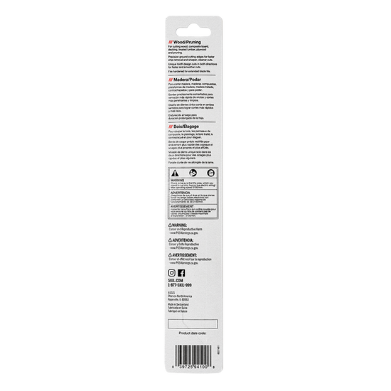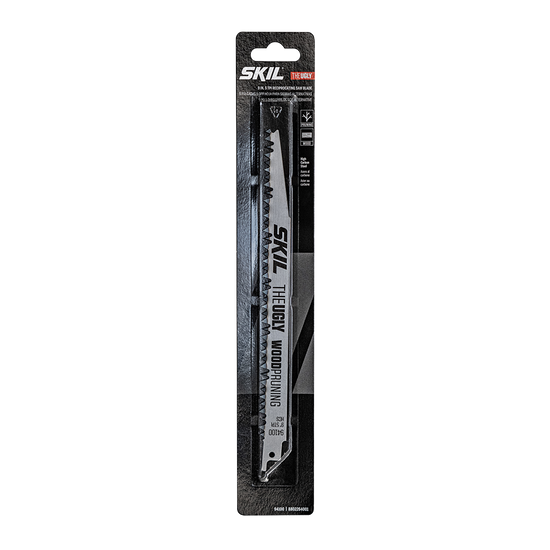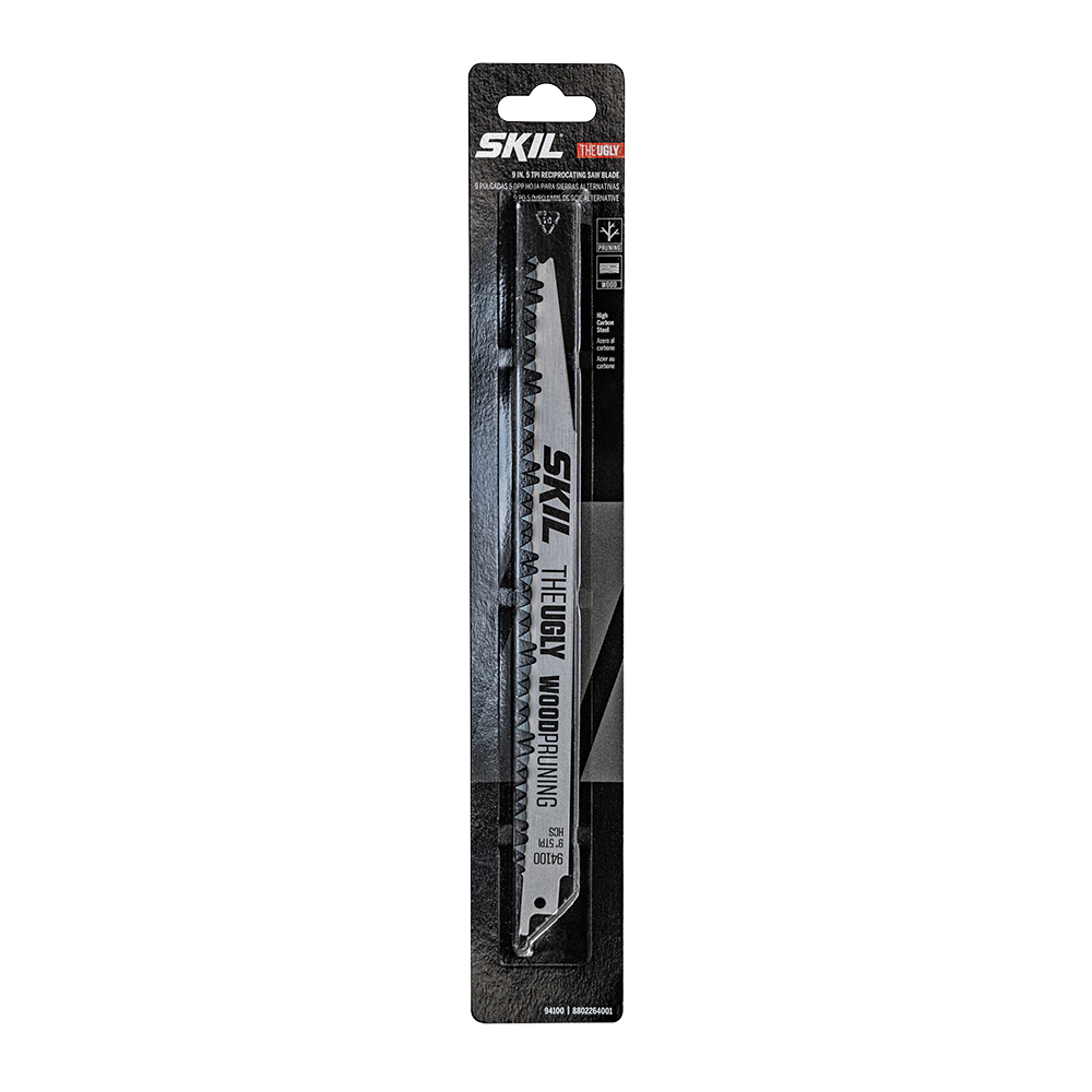 Prune trees and shrubs quickly or power through pressure-treated lumber, wet wood, composite board, and plywood with the UGLY SKIL 9-Inch 5-TPI Wood Cutting Reciprocating Saw Blade. This 9-inch reciprocating saw blade features fleam-ground teeth that cut in both forward and reverse directions for twice the cutting efficiency. The blade’s high-carbon steel cutting edge retains sharpness to keep your cuts straight with less vibration and superior control. Its 9-inch length makes it optimal for cutting tree branches and shrubs, or 4x4 and 6x6 wood posts. The one-piece design allows the saw blade to be rigid yet flexible for stronger cutting, with five teeth per inch well-fastened to the body of the blade for fast cutting. It’s an ideal reciprocating saw blade for pruning with the SKIL PWR CORE 20™ 20V Reciprocating Saw but is designed to fit most reciprocating saws.